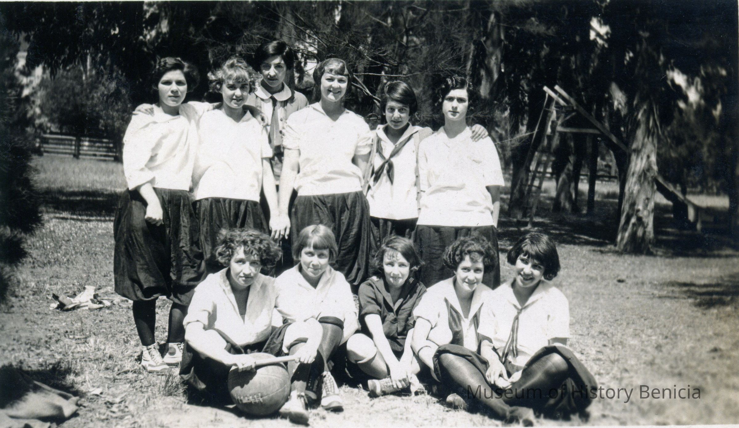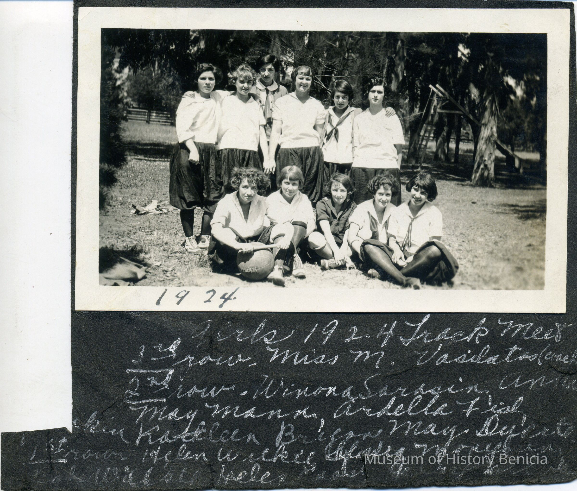 Glued to black album page and cut out. 11 girls in bloomers in a grove of trees. "Girls 1924 Track Meet 3rd row Miss M. Vasilatoo (coach) 2nd row Winona Sarasin, Anna May Mann, Ardella Fish, ____kin Kathleen Bryan, May Duarte 1st row Helen Wilkie, Sylvia Monybin[?], Babe Walsie[?], Helen Gow, Jenny[?] Silva". B/W photo.Collection