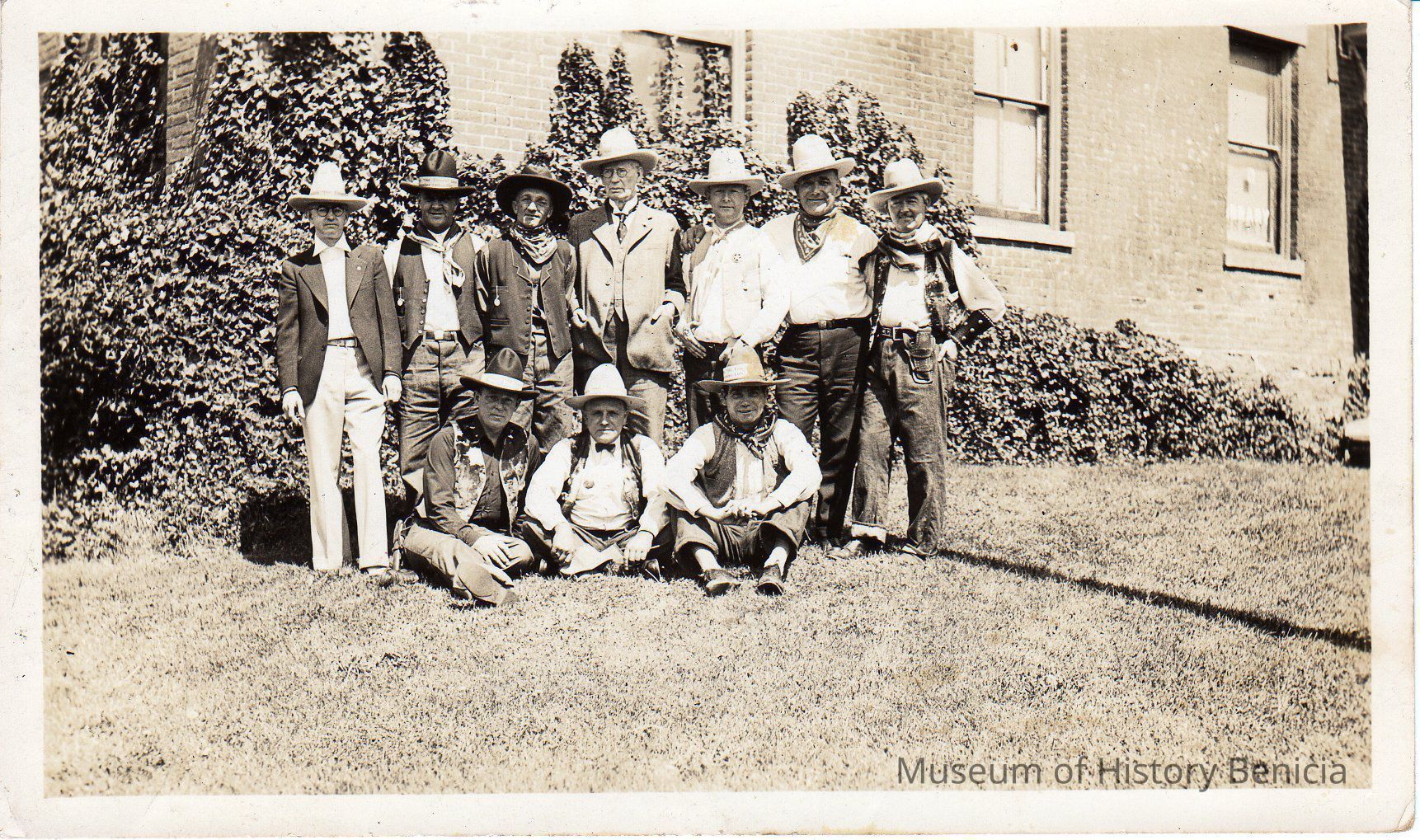 Black and white photo of seven men standing, and three seated, in front of Capitol. On back in ink: "Roland Wilson, Art Guibbini, Steve DeBenedetti, William L Crooks, Dutchy Williams, Ernie Gallardo, Jack O'Grady / sitting: Guy Headley, George Alves, George "Yokie" Joseph.