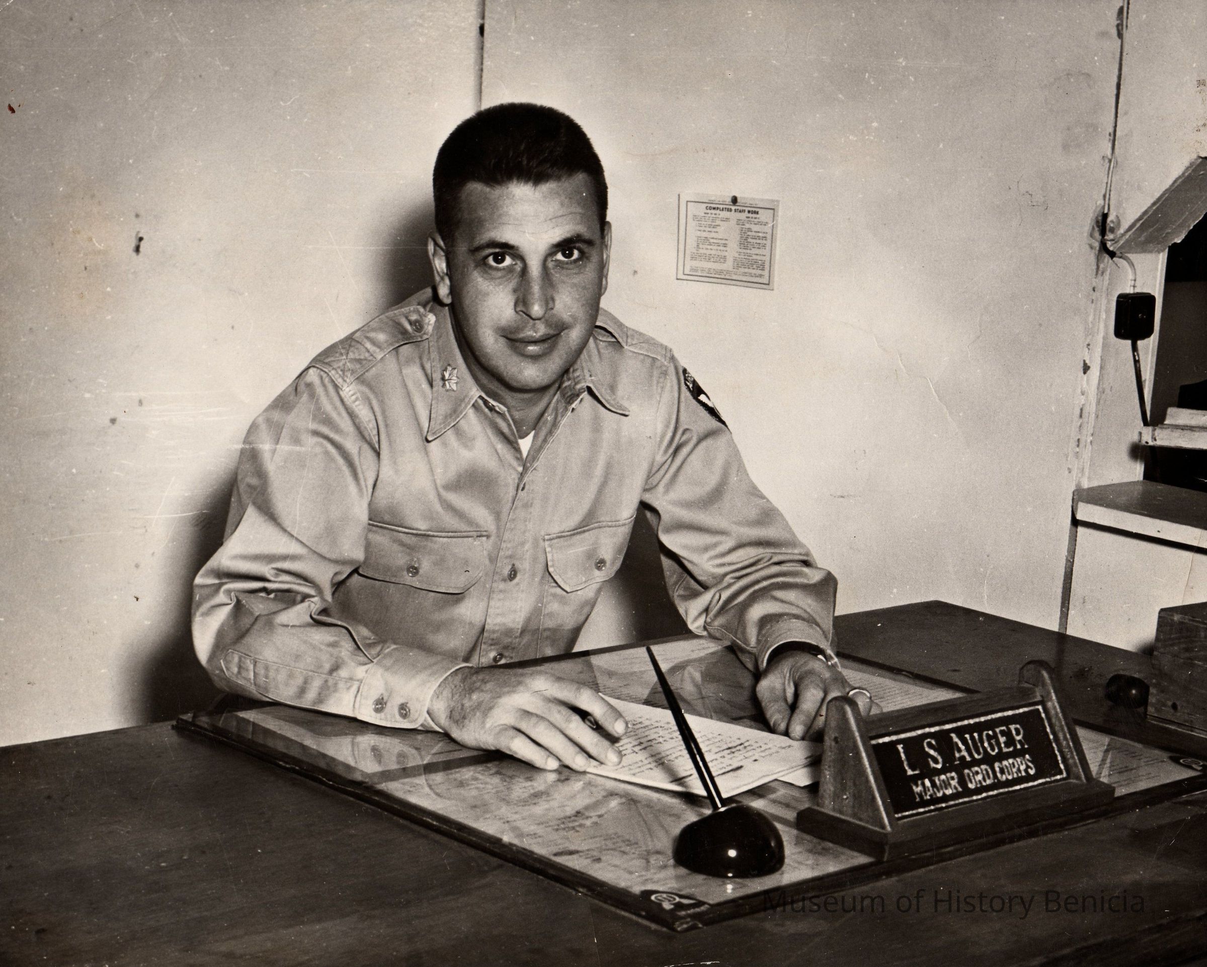 B/W photo of man at desk. "LS Auger Major Ord. Corps" on name plate. "Official Army Photo 11th ABN Division Photo Section" stamped on back.Collection