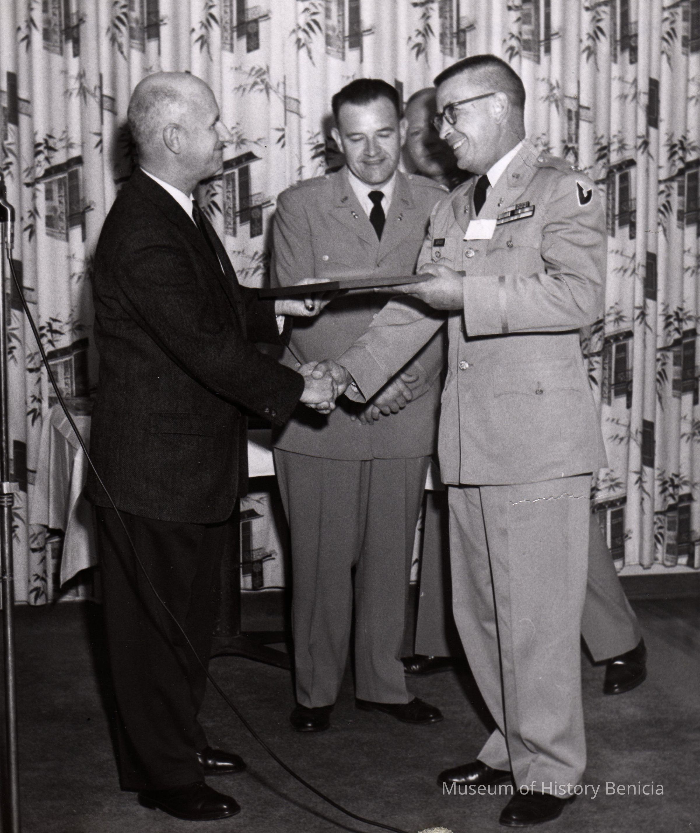 Black and white photo of four men at Officer's Club. Col. John Sheriden hands plaque to Lt. Col. Leonard Auger. Lt. Col. Vern Jensen in middle. 4th man slightly visible in back. "04071-28- ORD-1963" stamped on back. Names written in ink on back.Collection