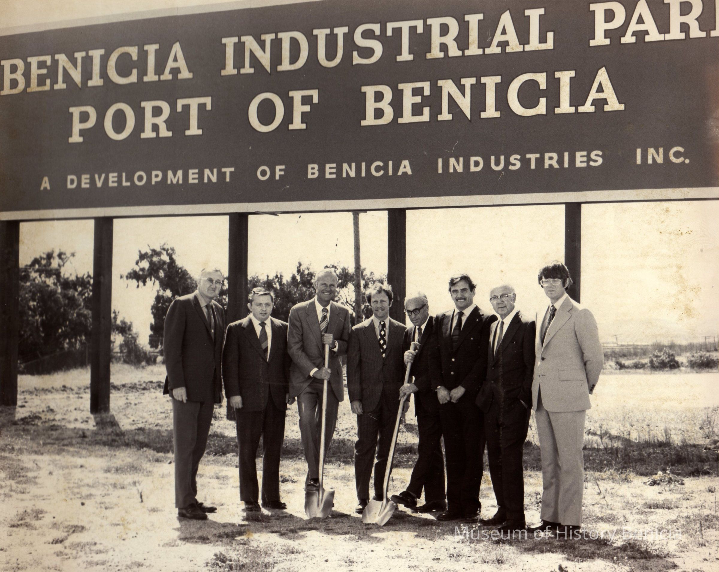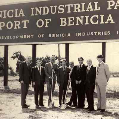 B/W Photograph: shows a group of eight men, two with shovels, under Benicia Industrial Park sign. This could represent the ground breaking for the Benicia Industrial Park.
