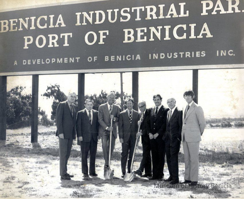 Left to right: Michael Fitzgerald, city council member; Marvin Kenny, city manager; David Stringfellow, President of Benicia Industries; Warren O'Blennis, city council member; James Lemos, Mayor of Benicia; Zeck Moreira; John Bohm, City Attorney; unidentified.Collection