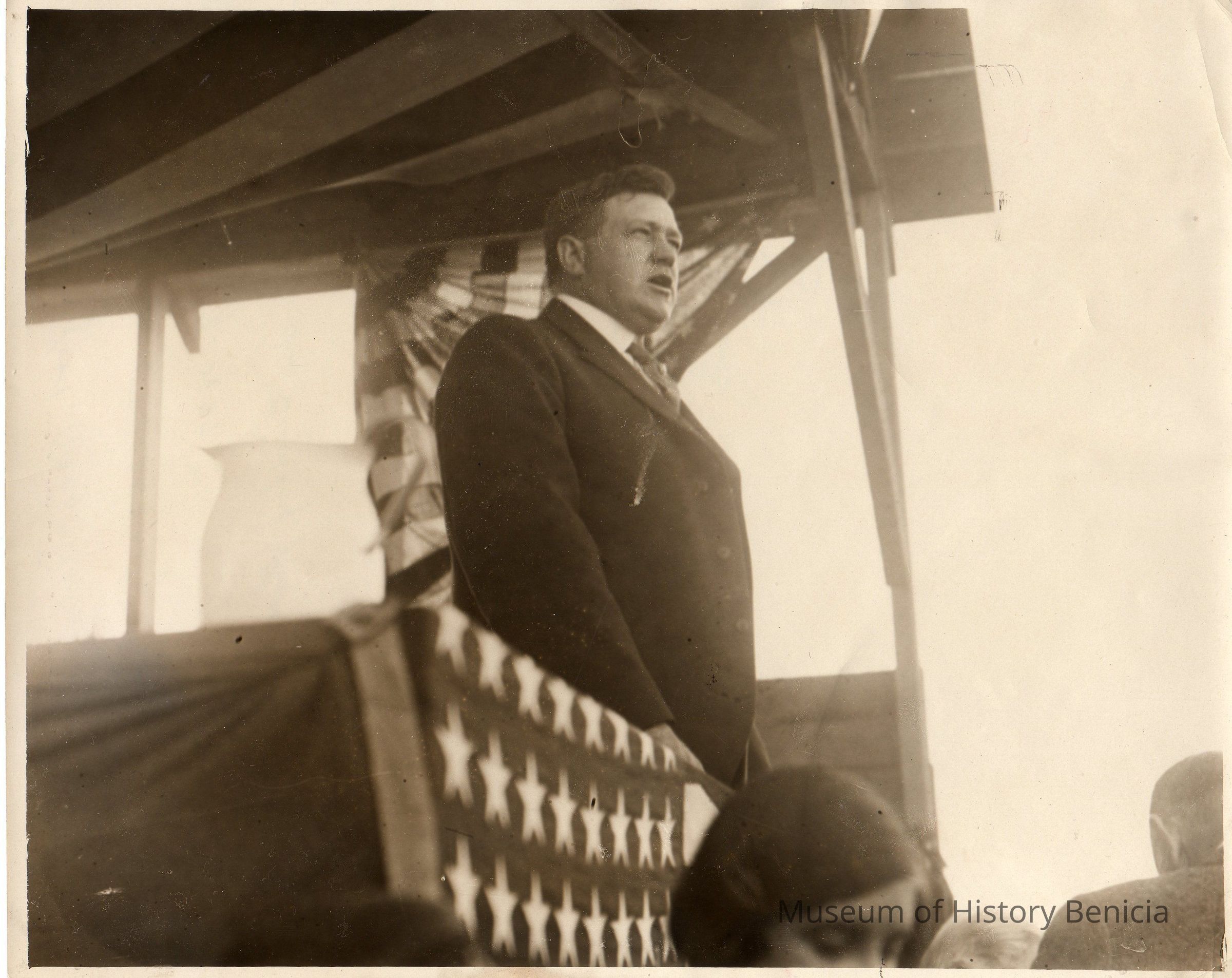 Man in dark suit speaking on rough platform with bunting. "Aven J. Hanford, Pres. Rodeo-Vallejo Ferry and the American Toll Bridge Co. May 7 1927? The day Lindbergh flew to France" [May 20-21 1927] on back. B/W photo.Collection