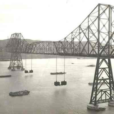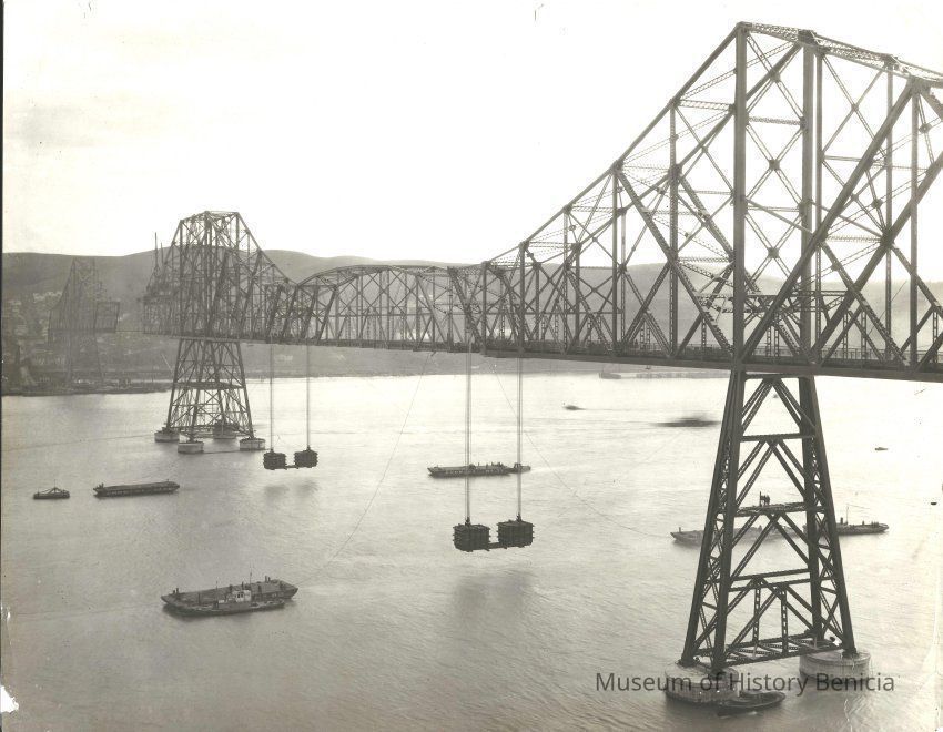 B/W view of most of the Carquinez Bridge, with one section missing and another just put into place. Crockett in background. "Carquinez Bridge 1926-27" on back in ink, and photographer's stamp.Collection