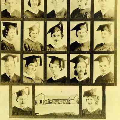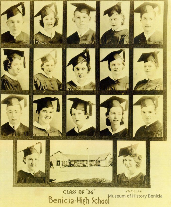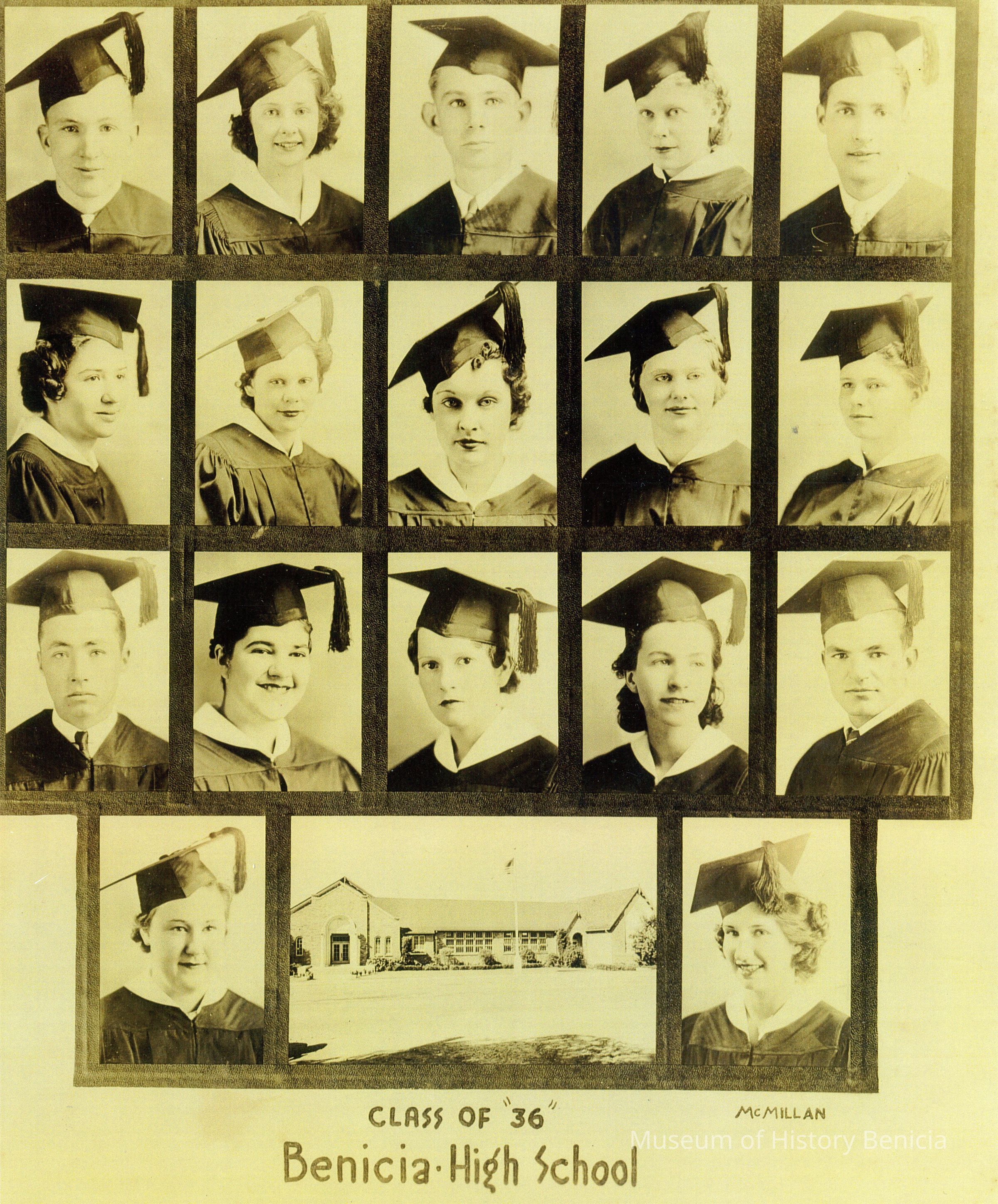 Photo of the 1936 Benicia High School Graduating class. These are individual photos with a picture of the school on the bottom. Looks like a reprint of the original photo. Names are on the back.Collection