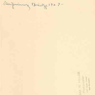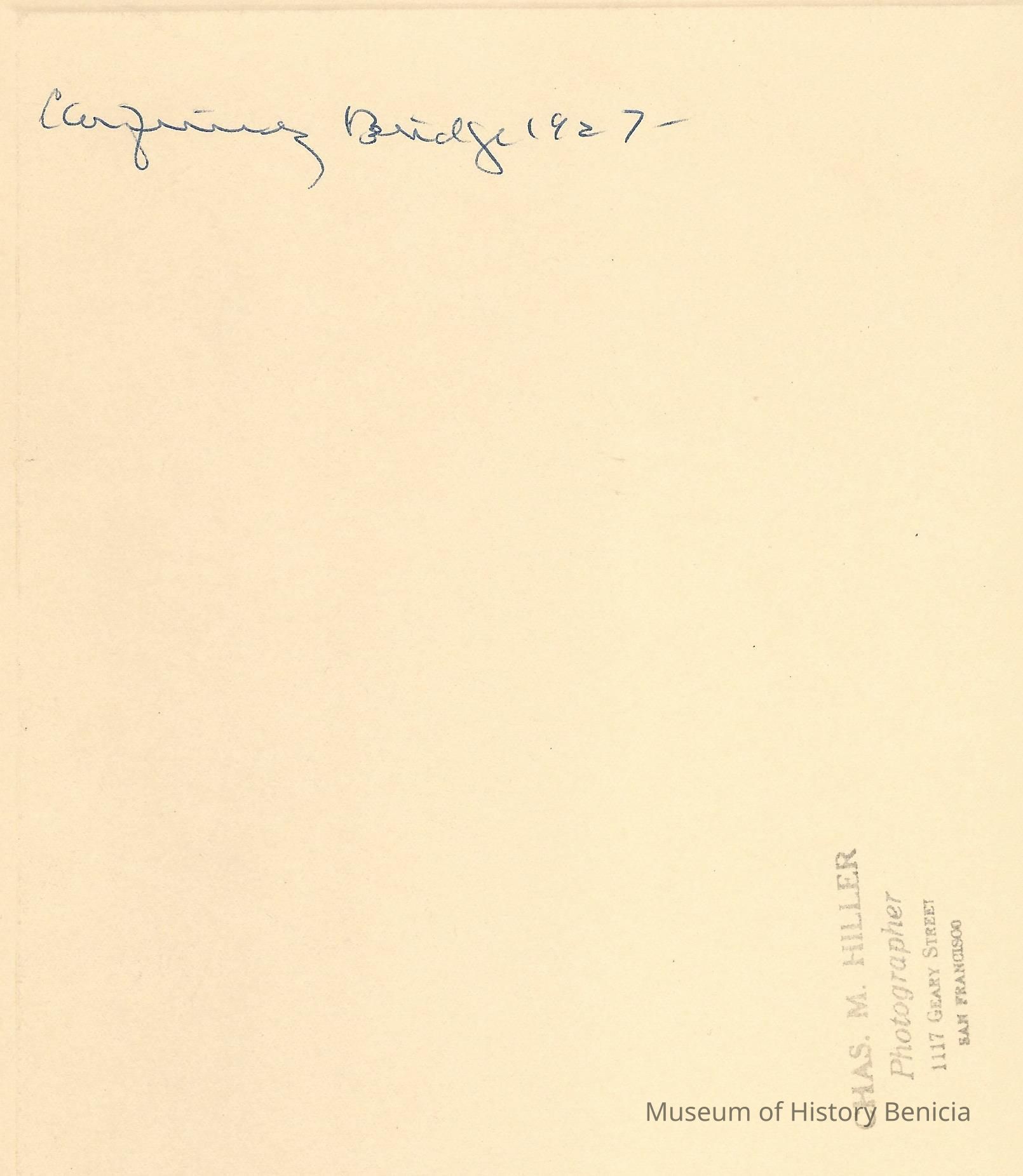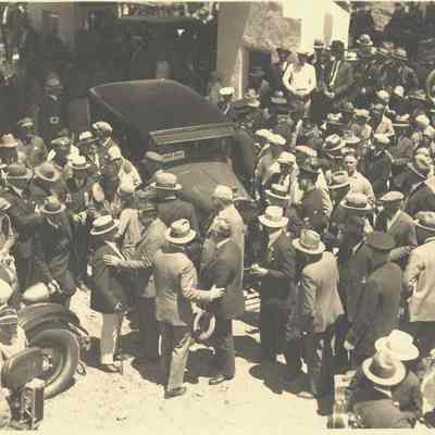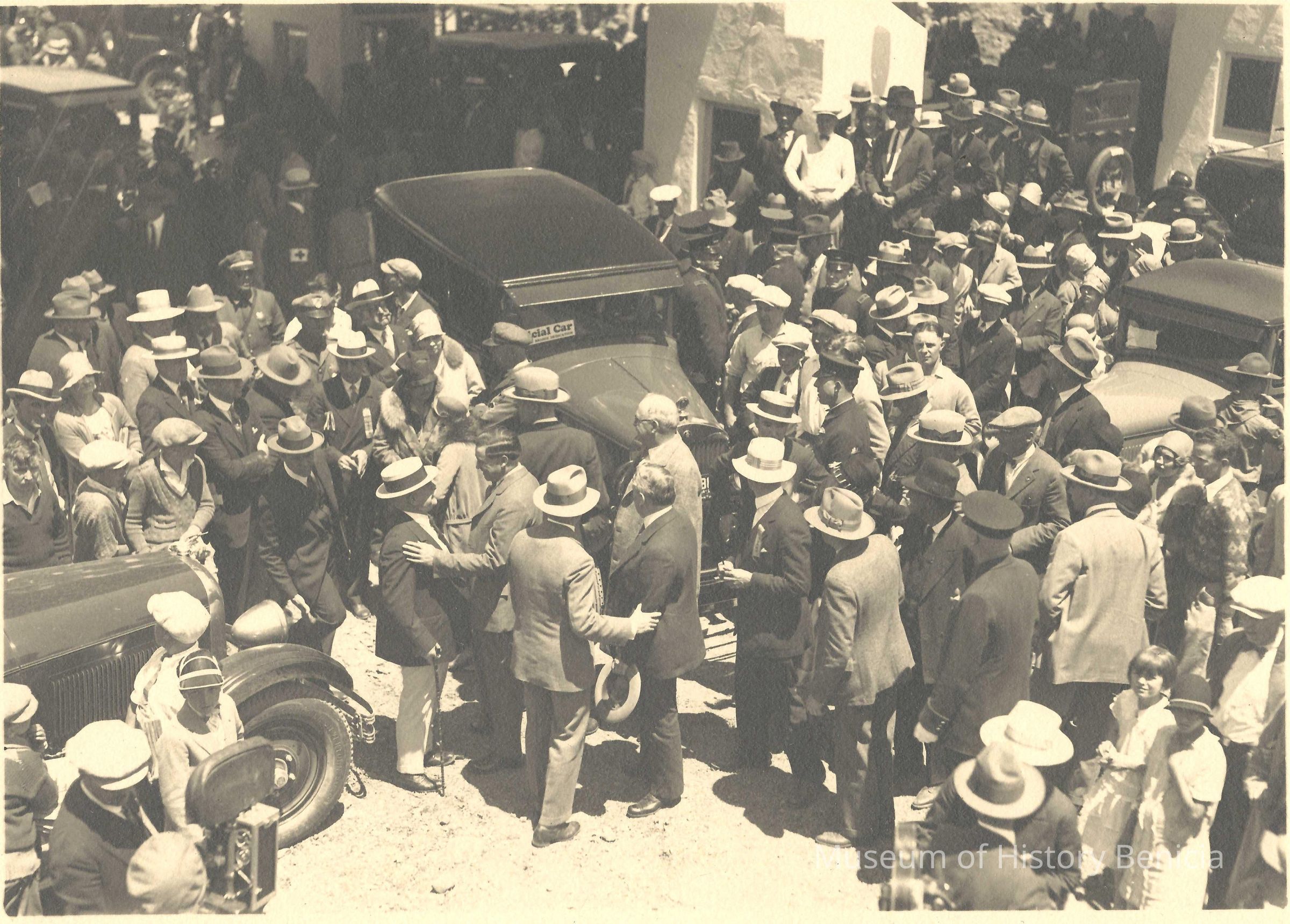 Carquinez Bridge dedication, 1927. Crowd of people and cars. One car with placard "Special Car". Movie camera in lower left? Same stamp and note on back as P3012.Collection