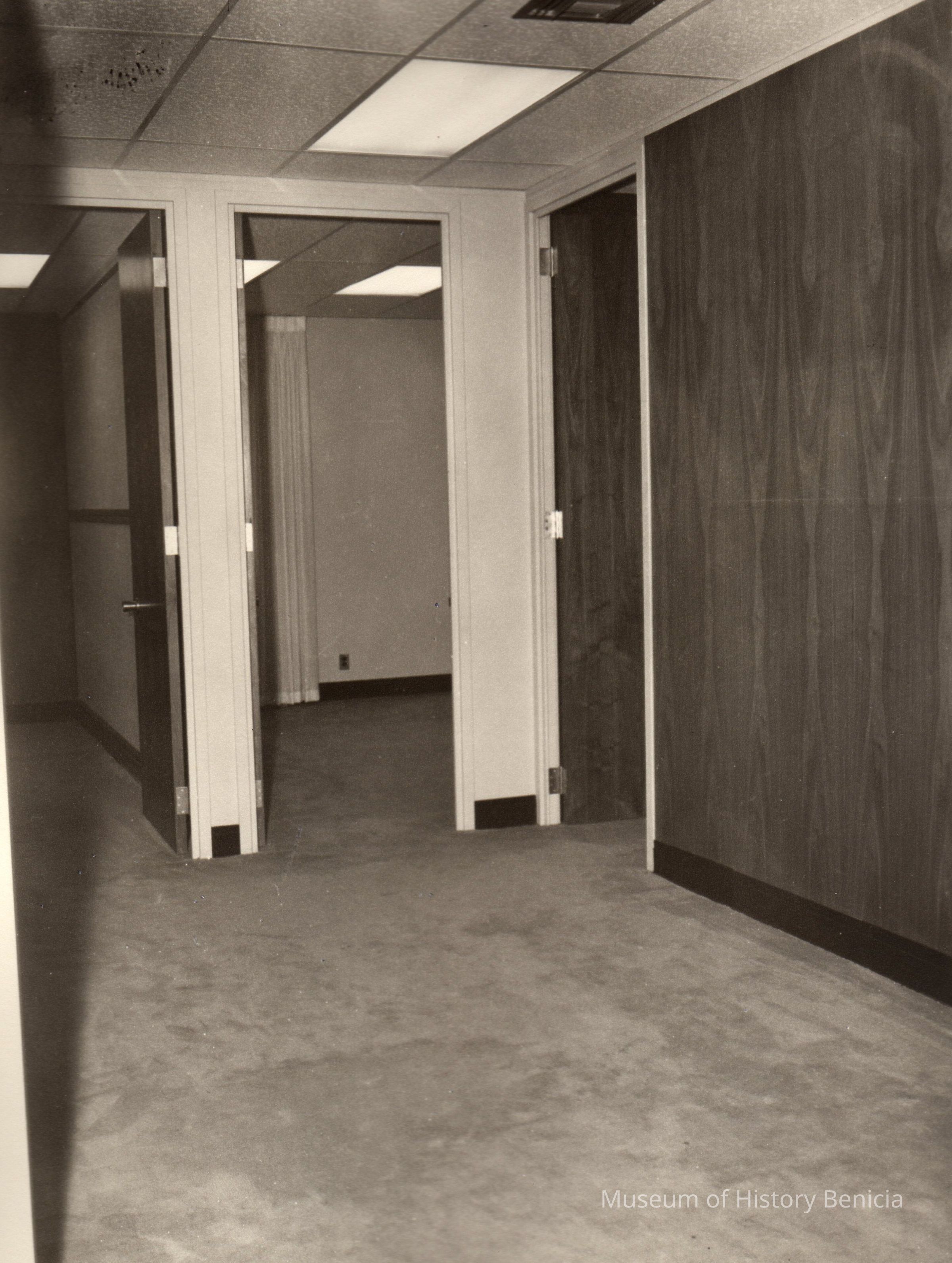 B/W photograph of inside hallway, paneled walls, and a room opening off hallway, in Arsenal headquarters.