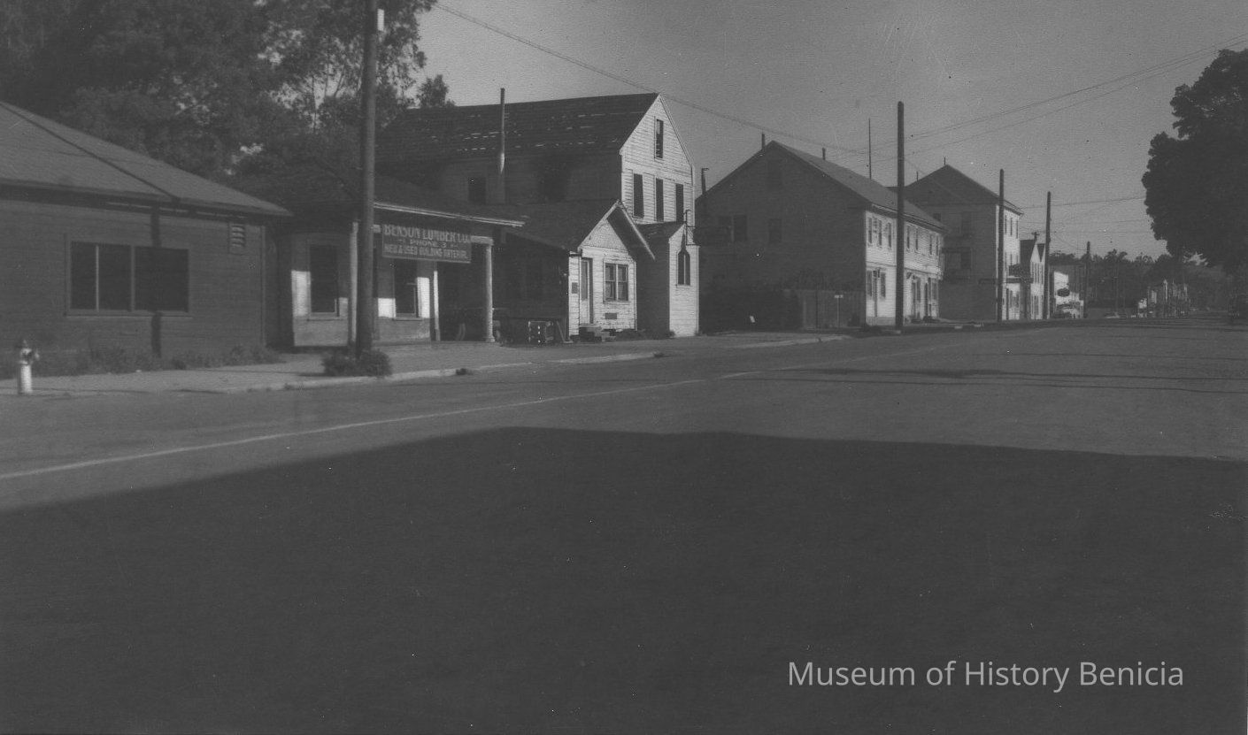 B/W photograph of 300 Block of First Street, circa 1940. Shows Johnson's Lumber Yard offices. Three-story building, St. Charles Hotel, later called Benicia Rooms. Washington House and Union Hotel also visible.