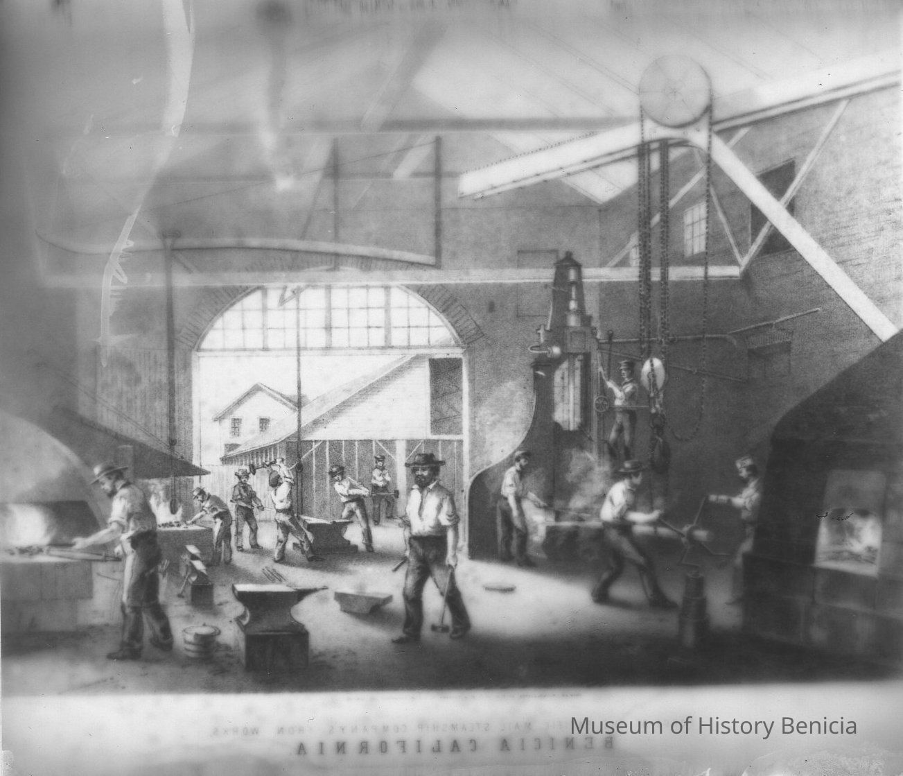 B/W Photograph of a Lithograph: Pacific Mail and Steamship foundry. P.M.& S. ships were repaired and serviced at the Benicia plant from 1859-69.