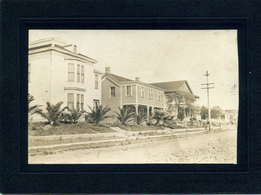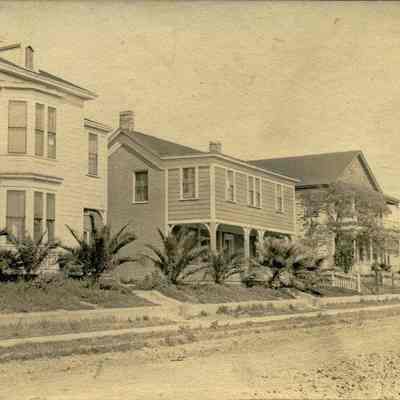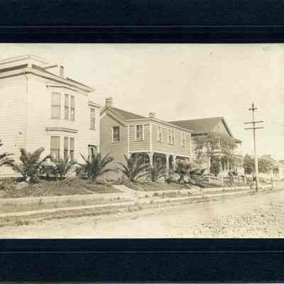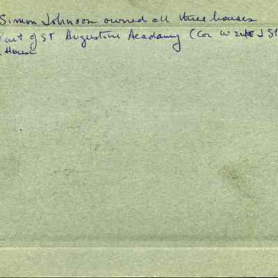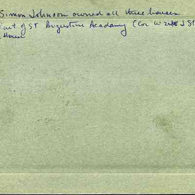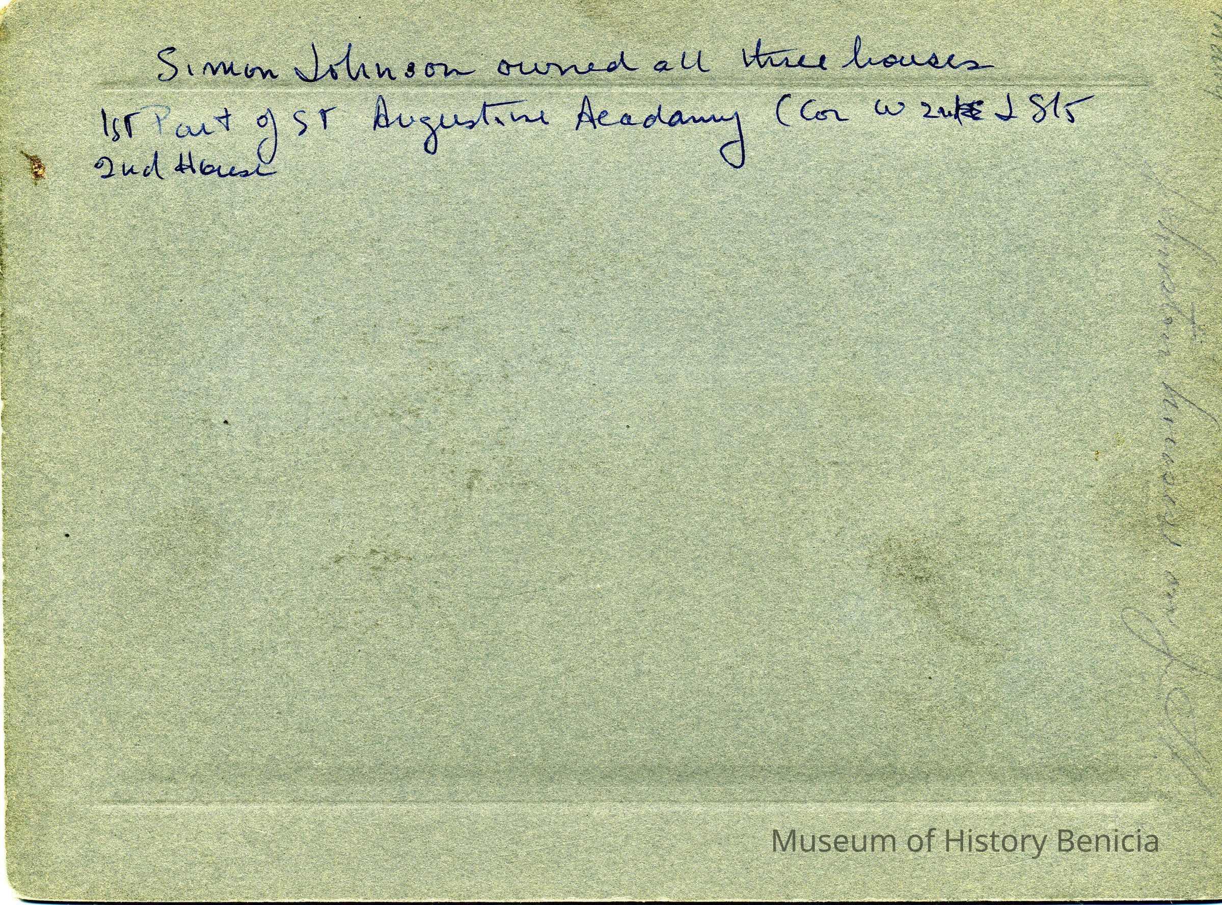 Photo of three houses on J street. On the back it says the three houses were owned by Simon Johnson. It also says they were part of St Augustine Academy (Cor W 2nd and J St. It says "2nd house at the bottom which may mean that only the 2nd house in the photo was part of St Augustine's.Collection