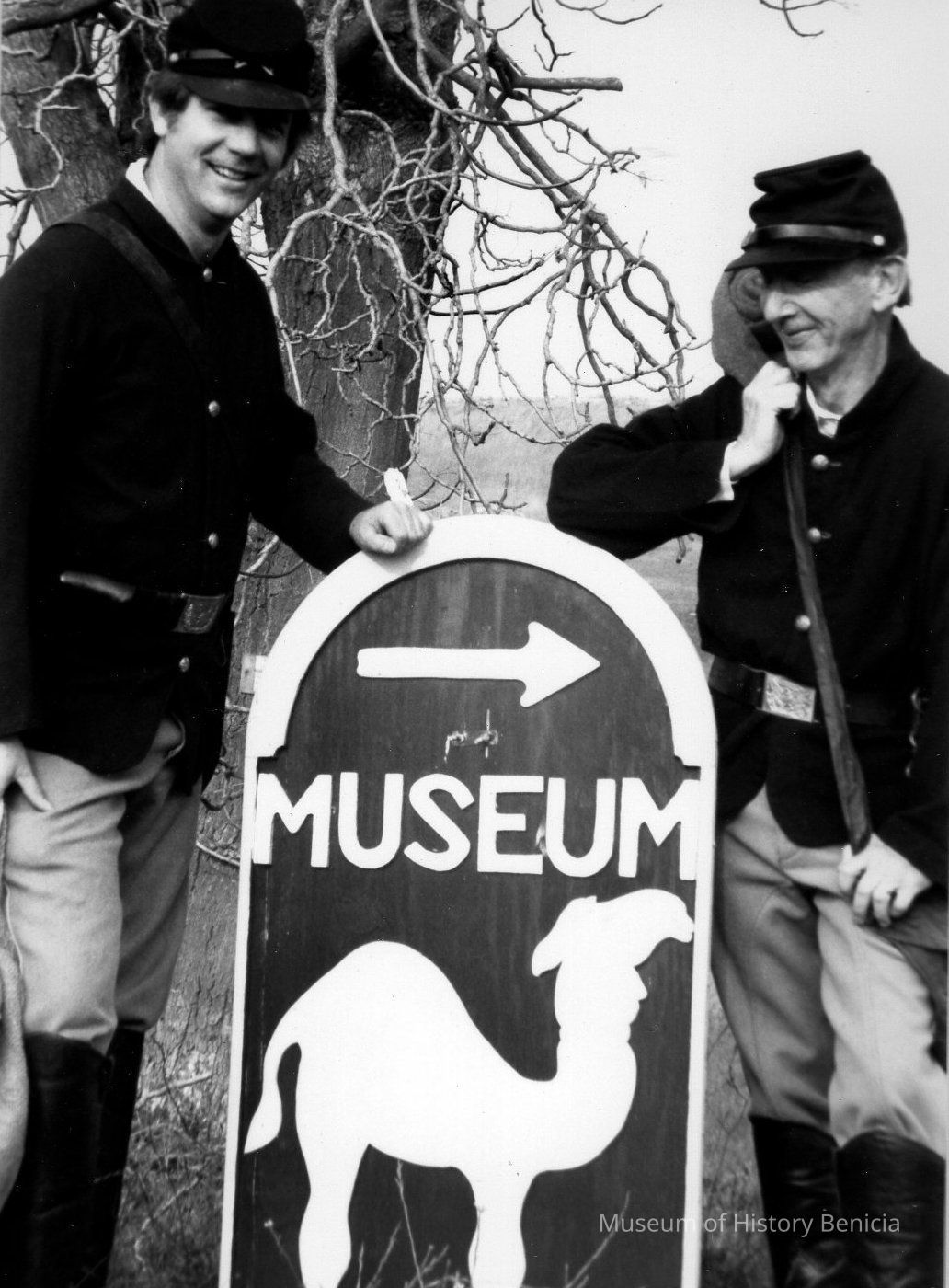 Civil War buffs Dave Stevens and Larry Rogers find their way to Camel Barn Museum for 5th anniversary of opening of Museum May 20, 1990. 1990 B/W photoCollection