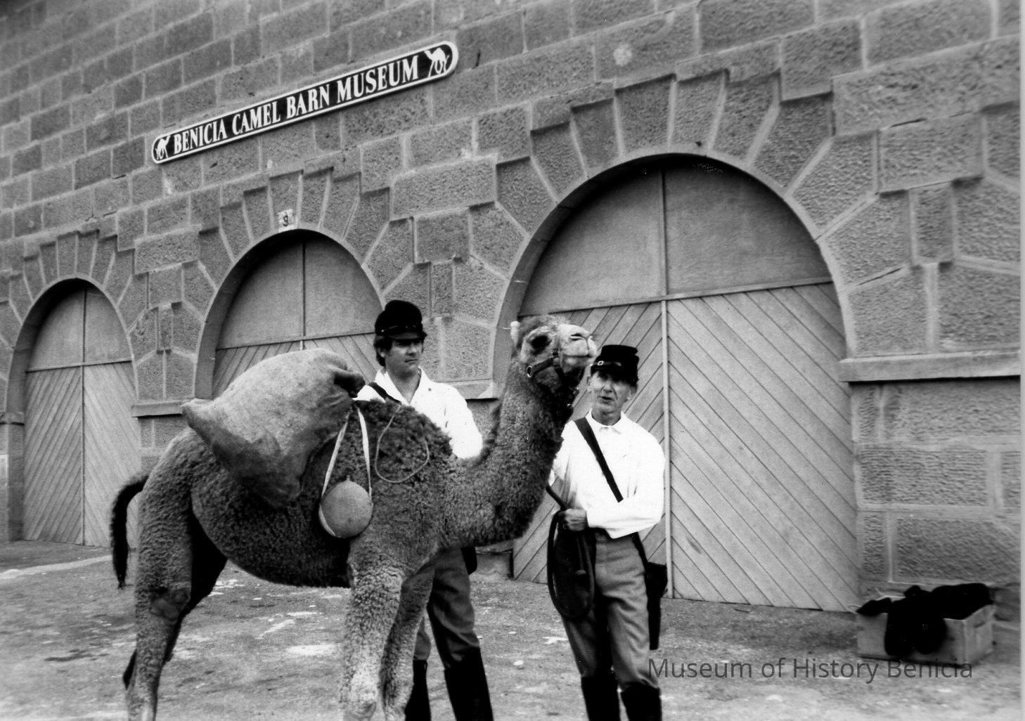 "Atar", camel from Marine World with Civil War Buffs, Dave Stevens and Larry Rogers. 1990 B/W photo goes with BHM98.99.40