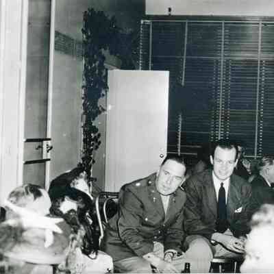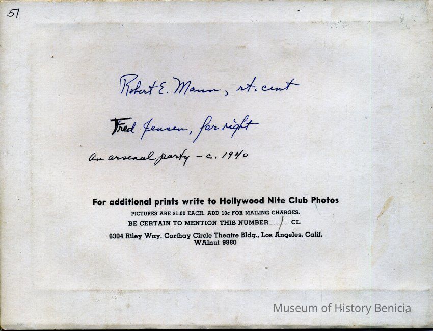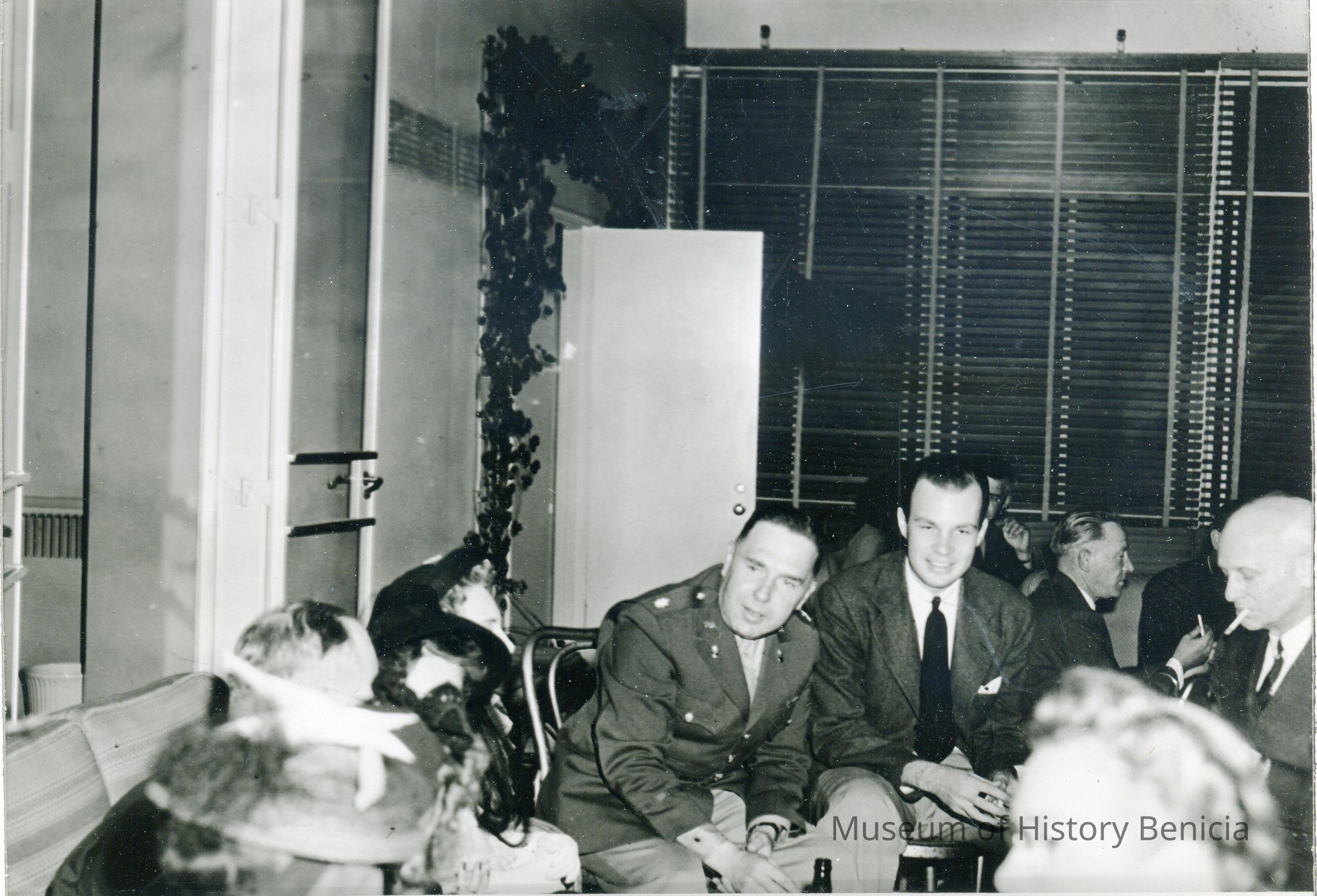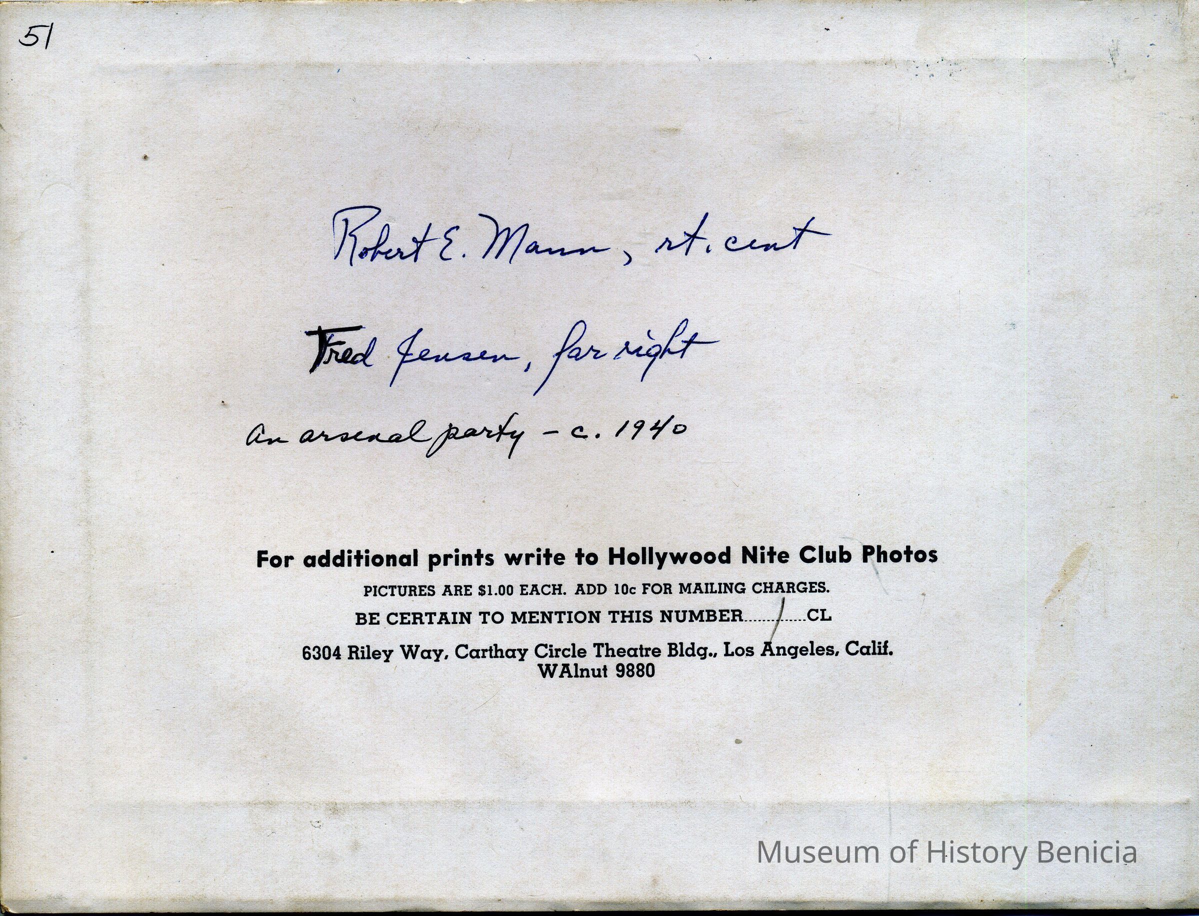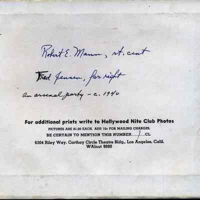 Photo taken at the Hotel Claremont in Berkeley, CA circa 1940. The back identifies the man at right center as Robert E. Mann and the man at far right as Fred Jensen.Collection