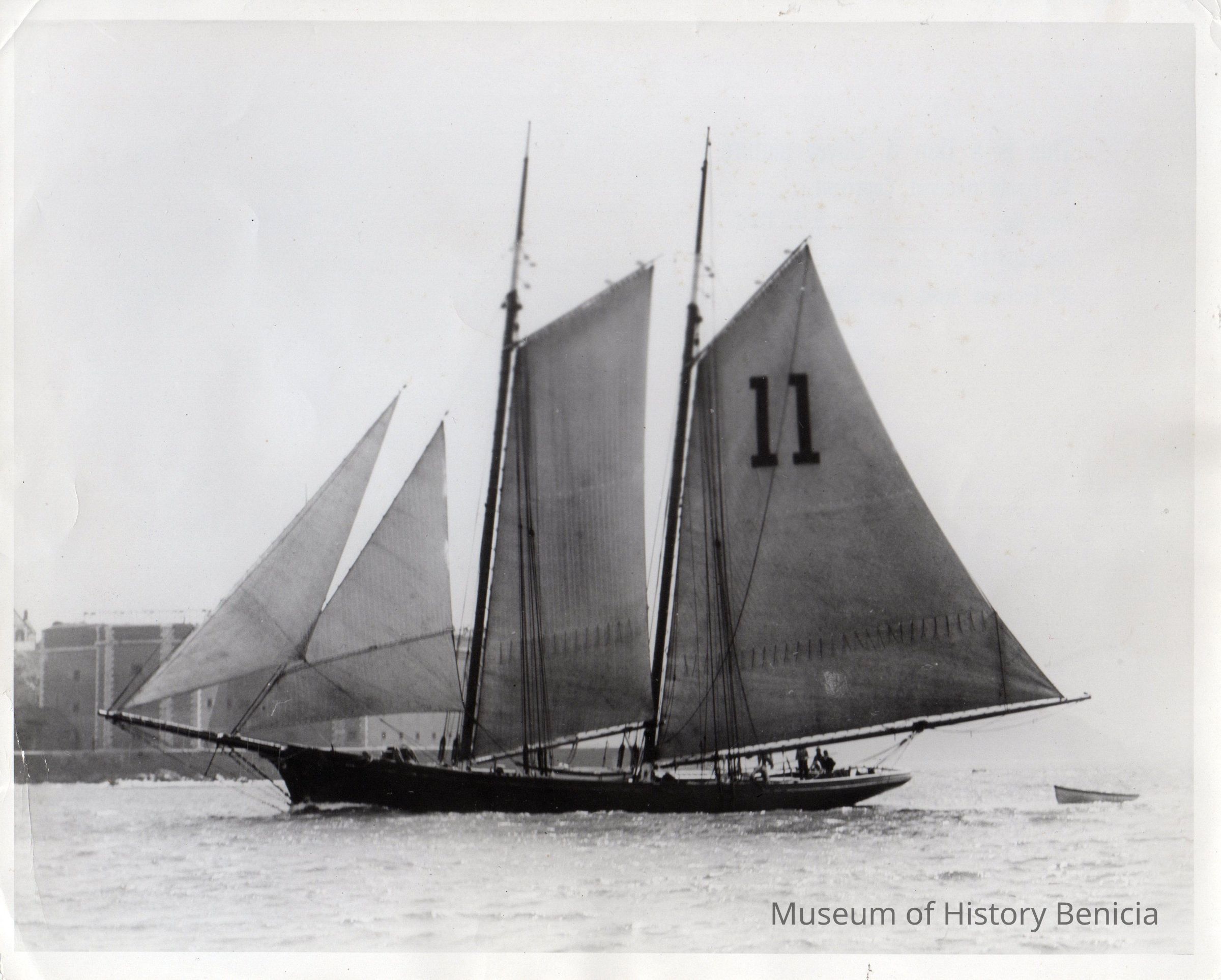 Photograph of the Matthew Turner pilot schooner "America" built in 1888. The schooner with the number 11 on the sails was used in yacht racing in the San Francisco Bay. Fort Point can be seen in the background.Collection