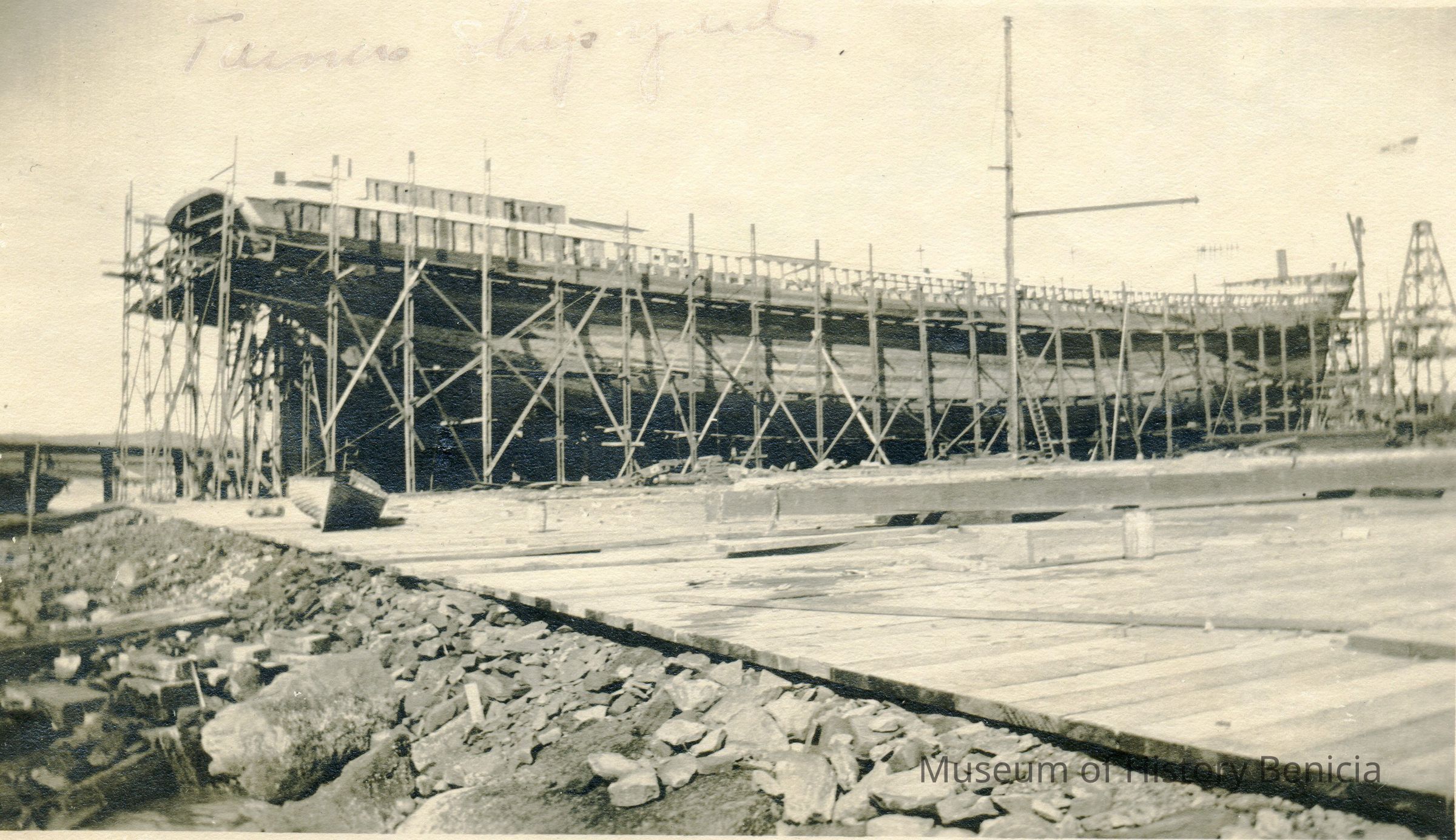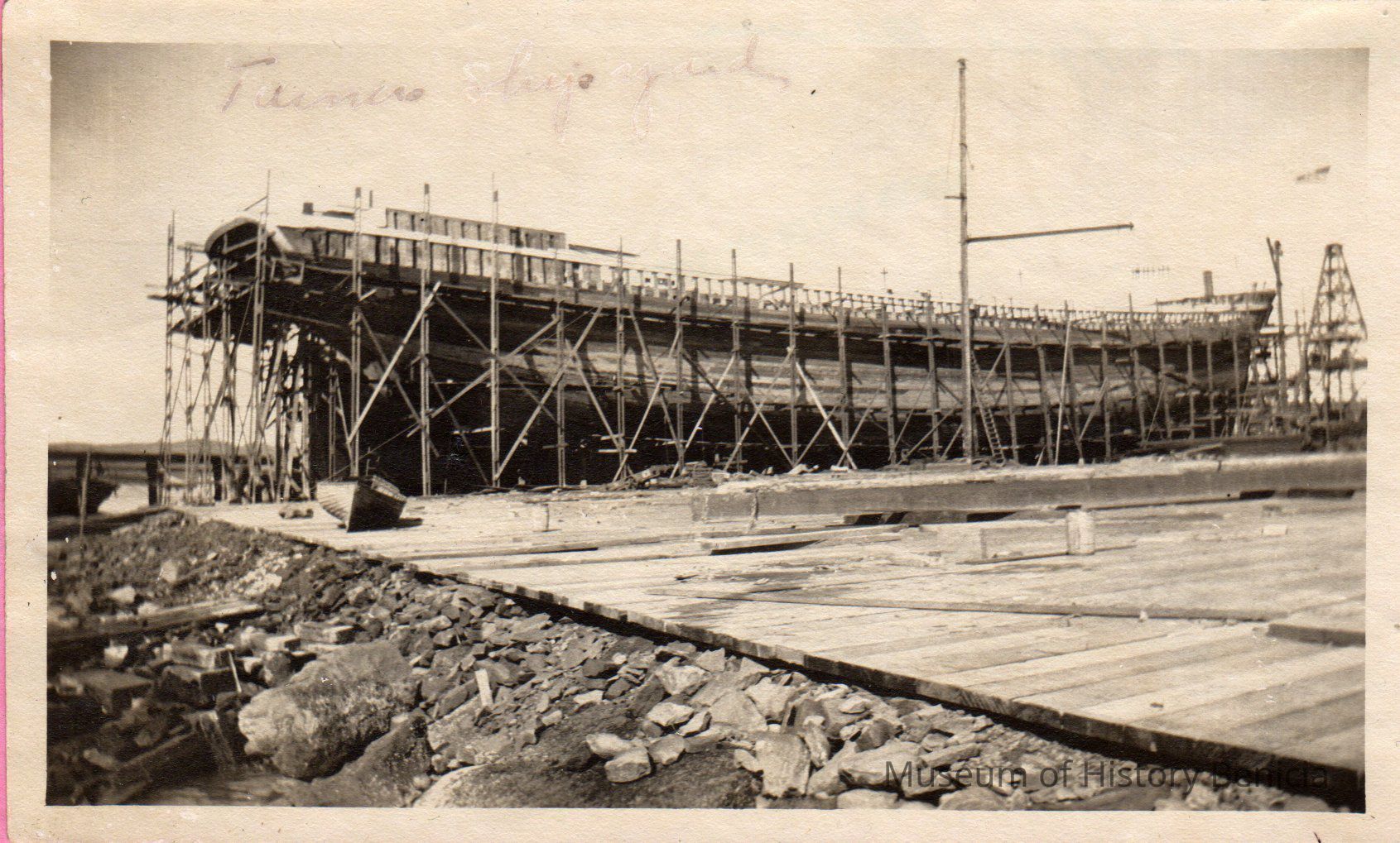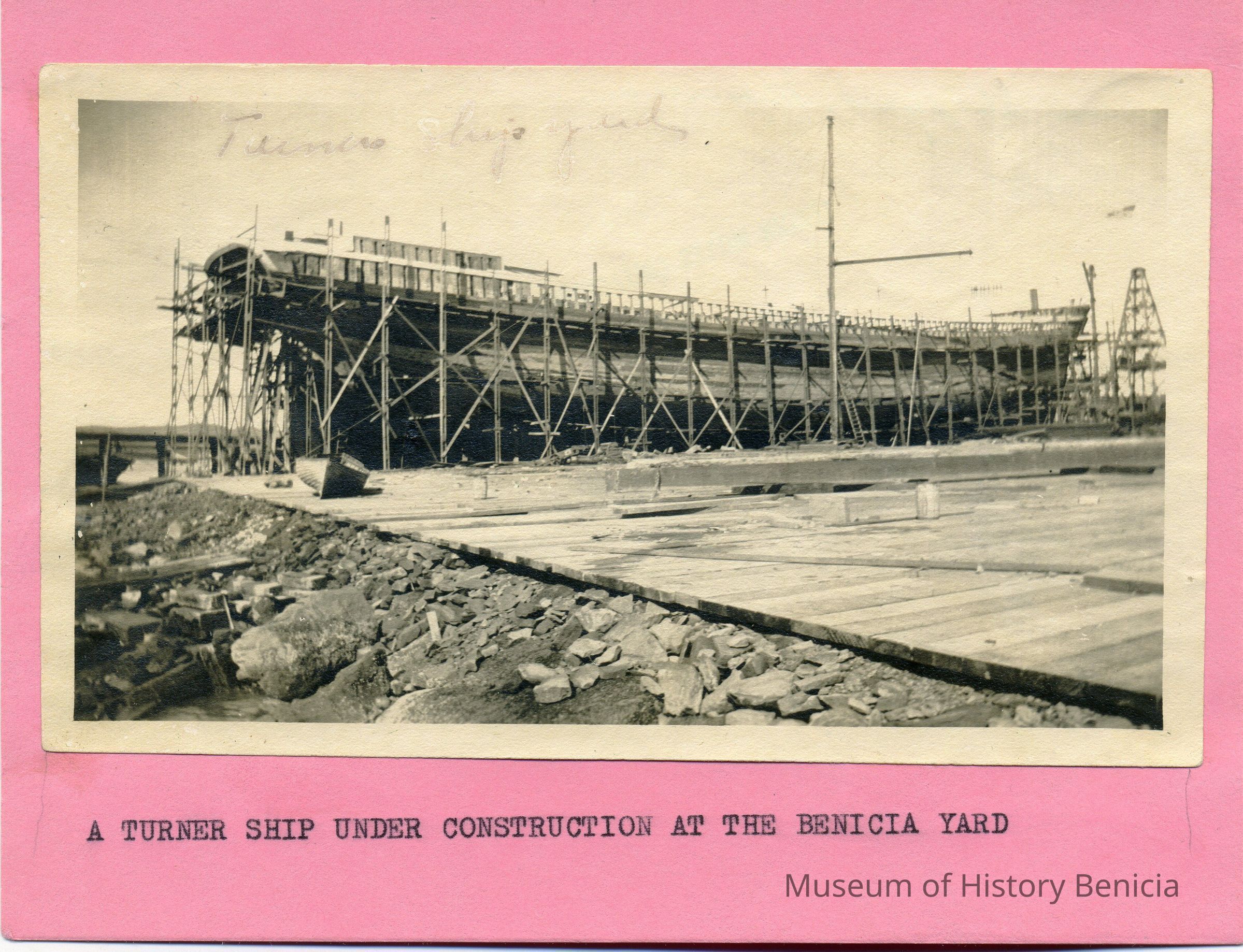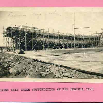 B/w photograph of a ship under construction at the Matthew Turner shipyard. Mounted. The Lenoir Miller Collection.