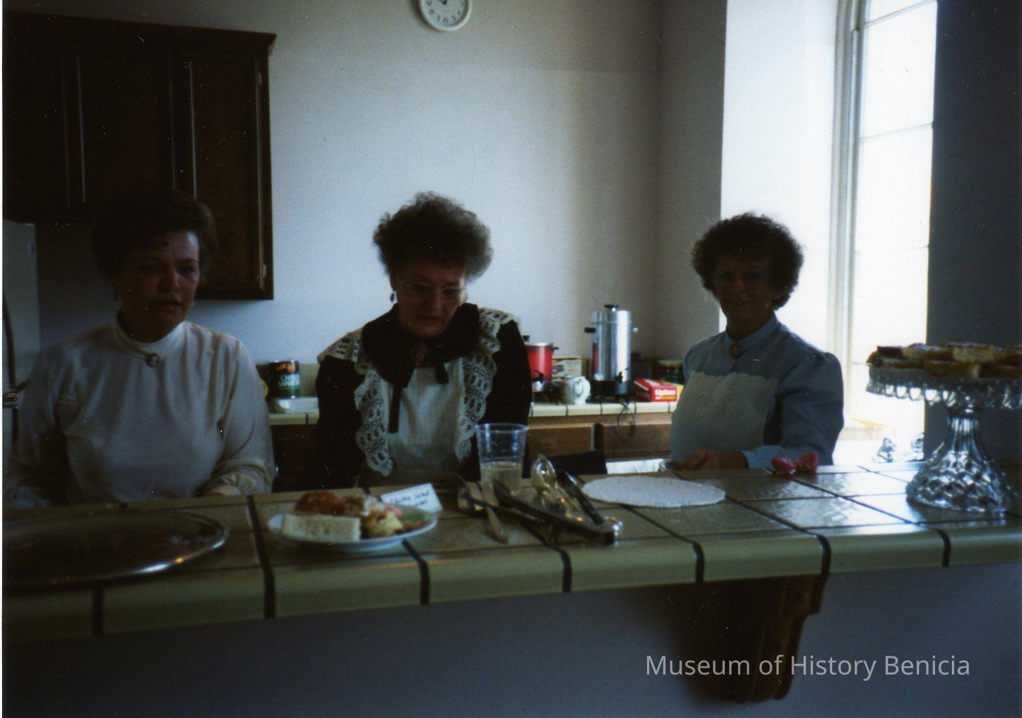 color photo of three ladies behind the serving counter in the kitchen in Stone Hall; left to right: Malee Ketchum, June ______, Judy BowlesCollection