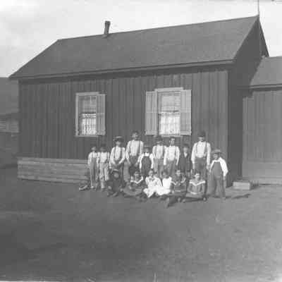 Is part of a set of four B/W prints of Sulphur Springs (Sky Valley) School, some students and adults, circa 1900. The prints are mounted on an 11"x12-1/4" matte board.