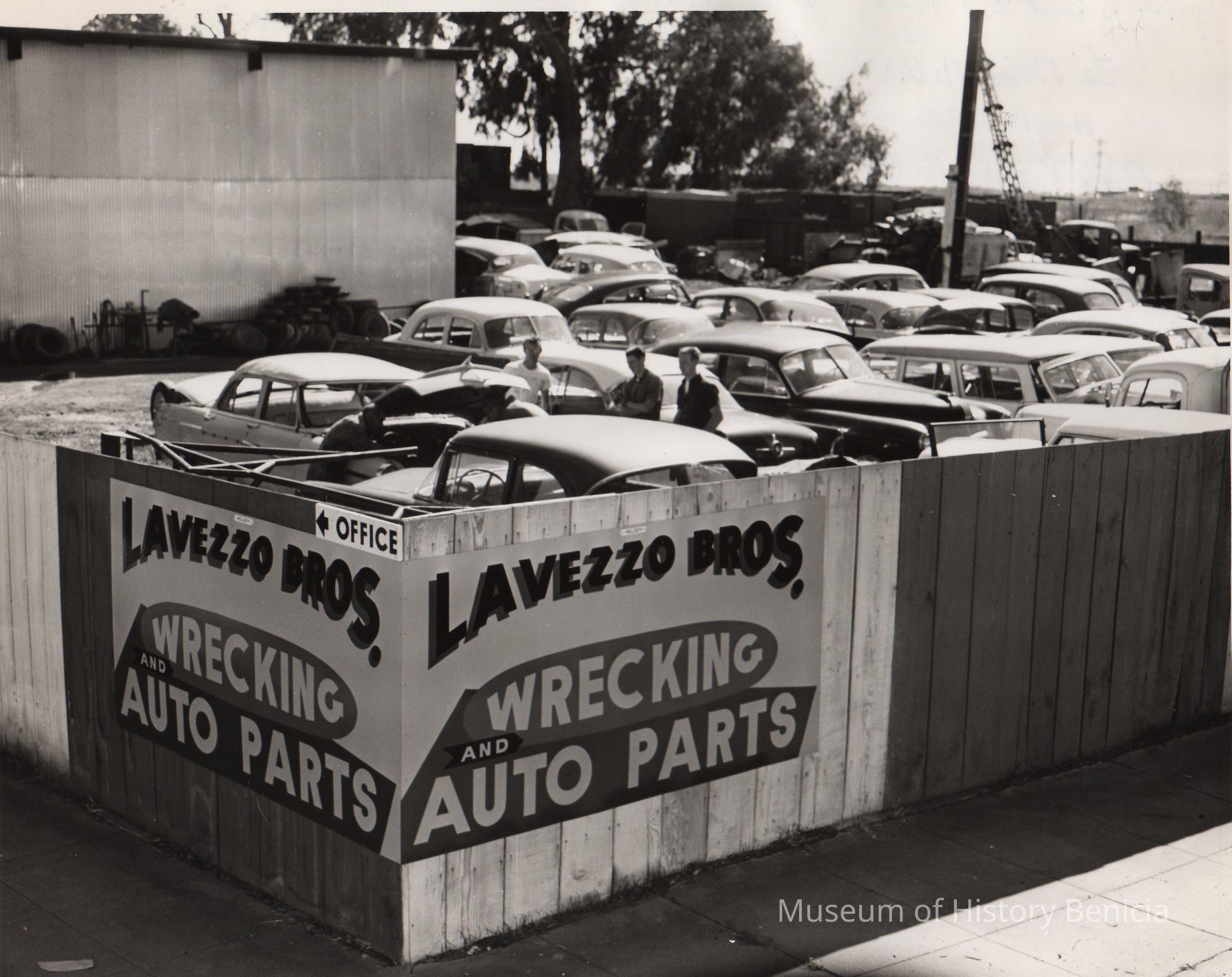 B/W Photograph: Lavezzo Brothers Wrecking Yard, located at East D and First Streets. Three young men are shown looking at a vehicle being serviced by a fourth man (car's hood is open).Collection