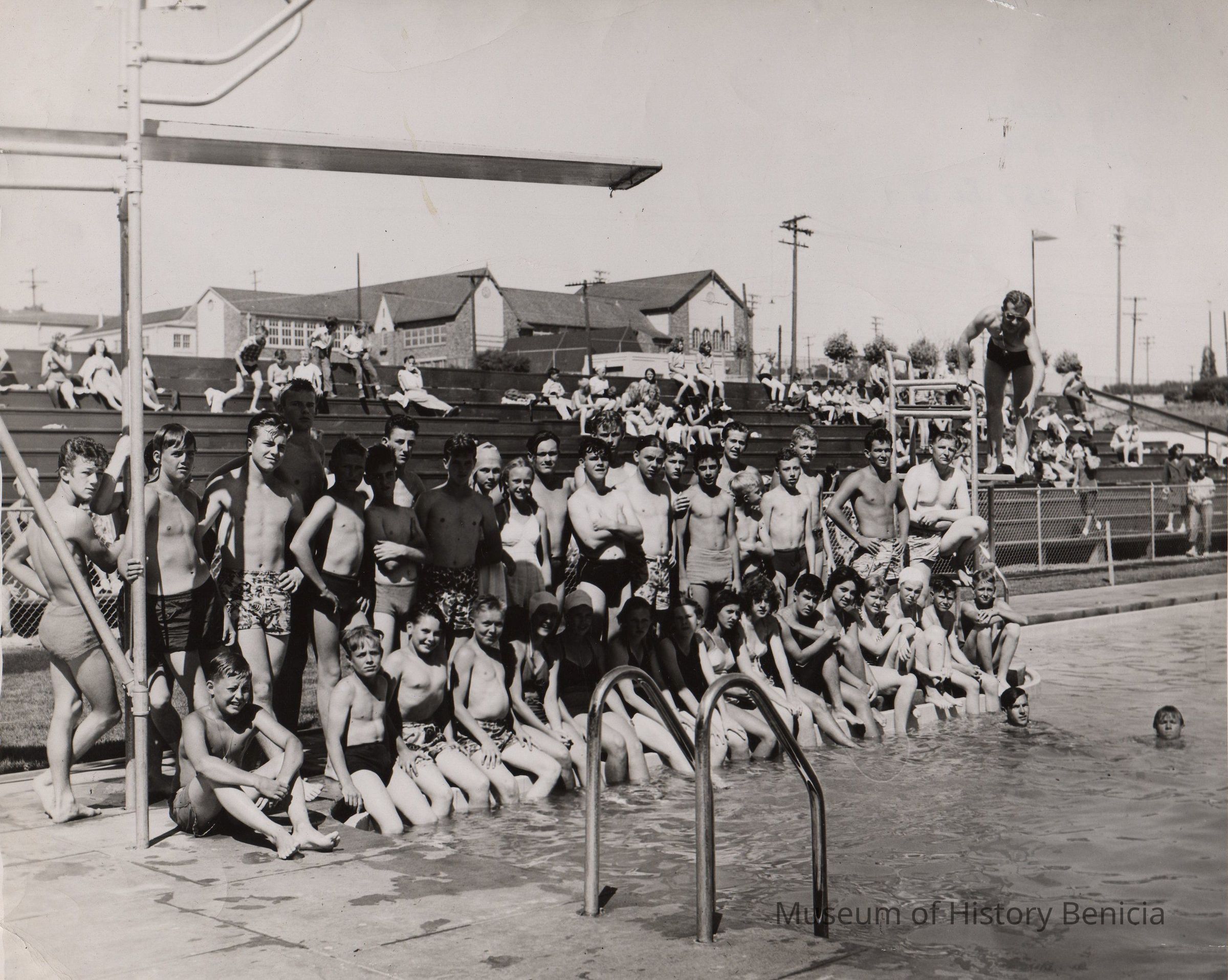 B/W Photograph: a group of young swimmers are sitting on the deck and standing next to diving area of James Lemos Swimming Pool before remodeling, two swimmers are in the water. A lifeguard is on his stand. Old bleachers can be seen to the north of the pool. Also in background is Benicia High School.