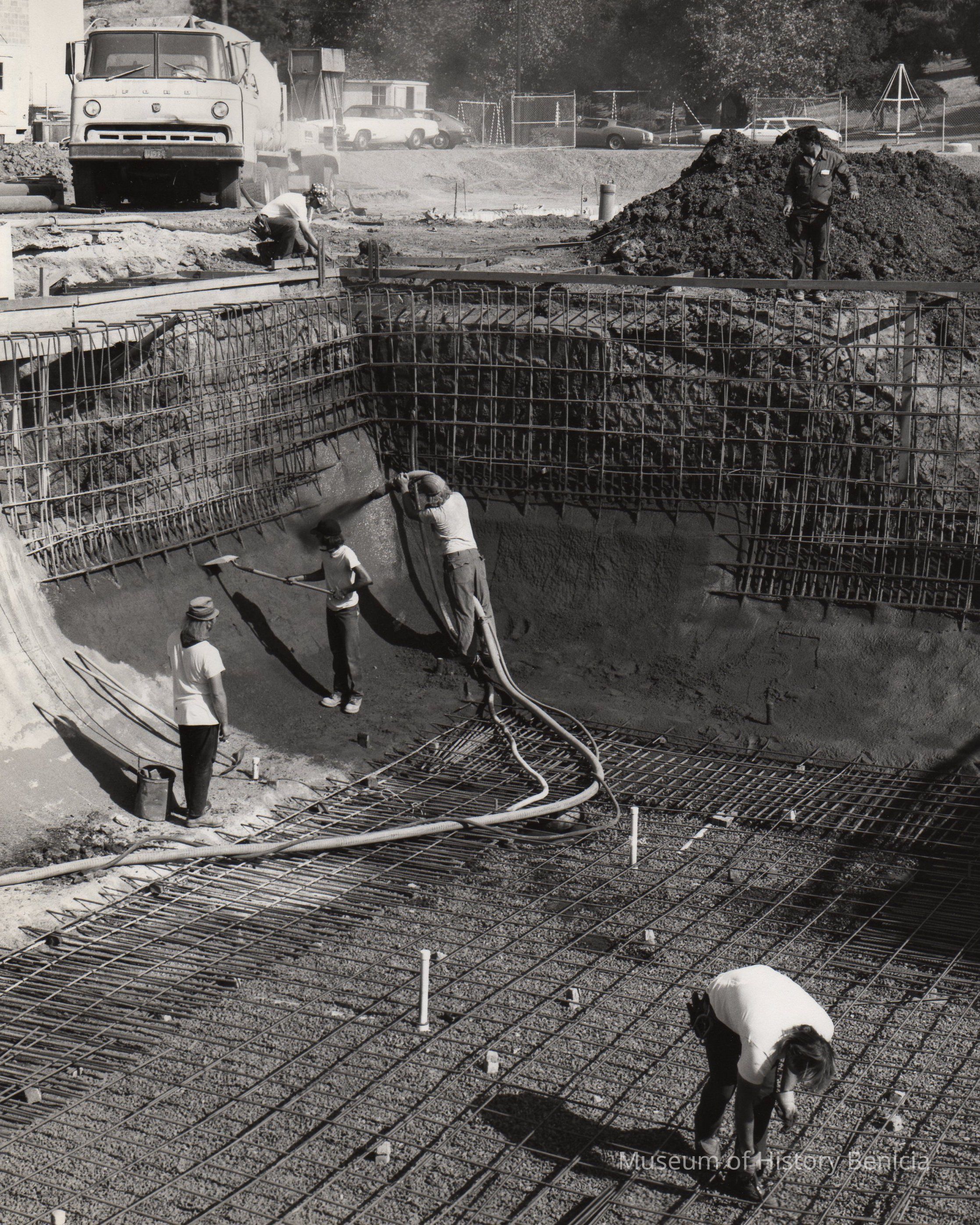 B/W Photograph: Reconfiguration and construction of diving section of James Lemos Swimming Pool on East J Street . Shows workers prepping for new walls.Collection