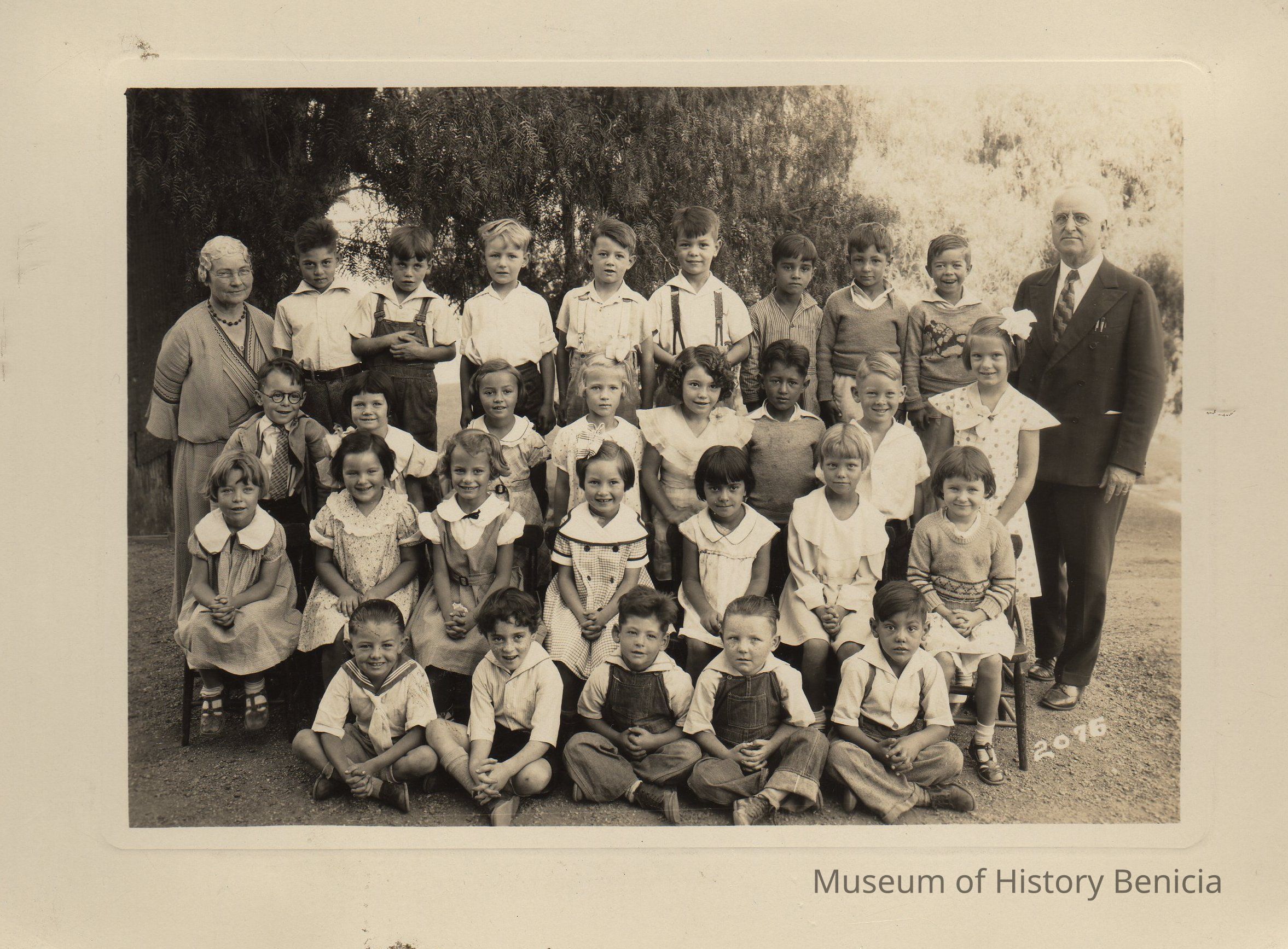 B/W Photograph: First grade class photo, 1934, at Primary School on East Third Street. Left: Miss Ellen Foley, teacher. Right: Mr. Short, principal. Pupils are not identified.Collection