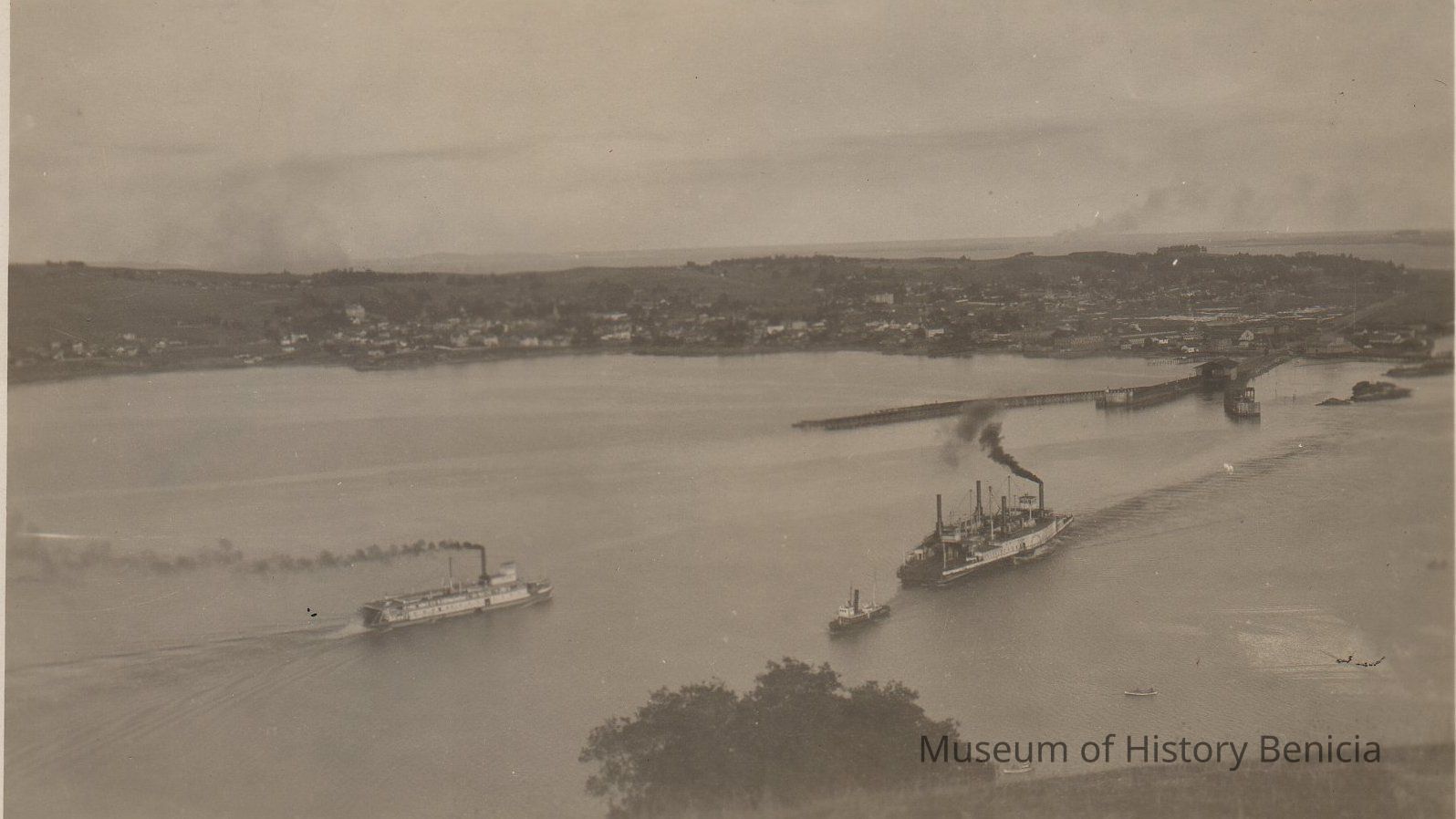 B/W Photograph: shows a paddlewheel ship getting ready to pass a train ferriy in Carquinez Strait. Shows ferry slip at Benicia in the background.Collection
