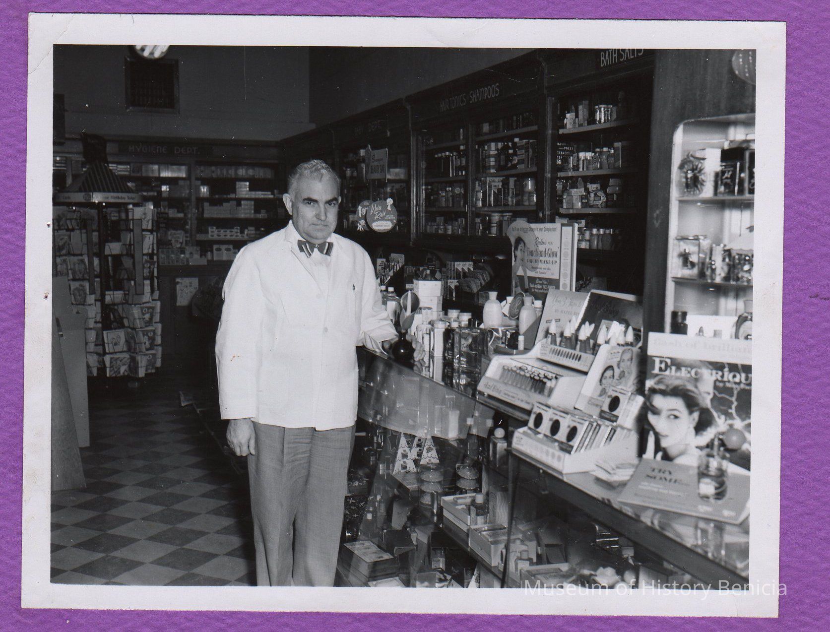 B/W Photograph: George Wolff operated Wolff's Drug Store. He is shown inside his store.