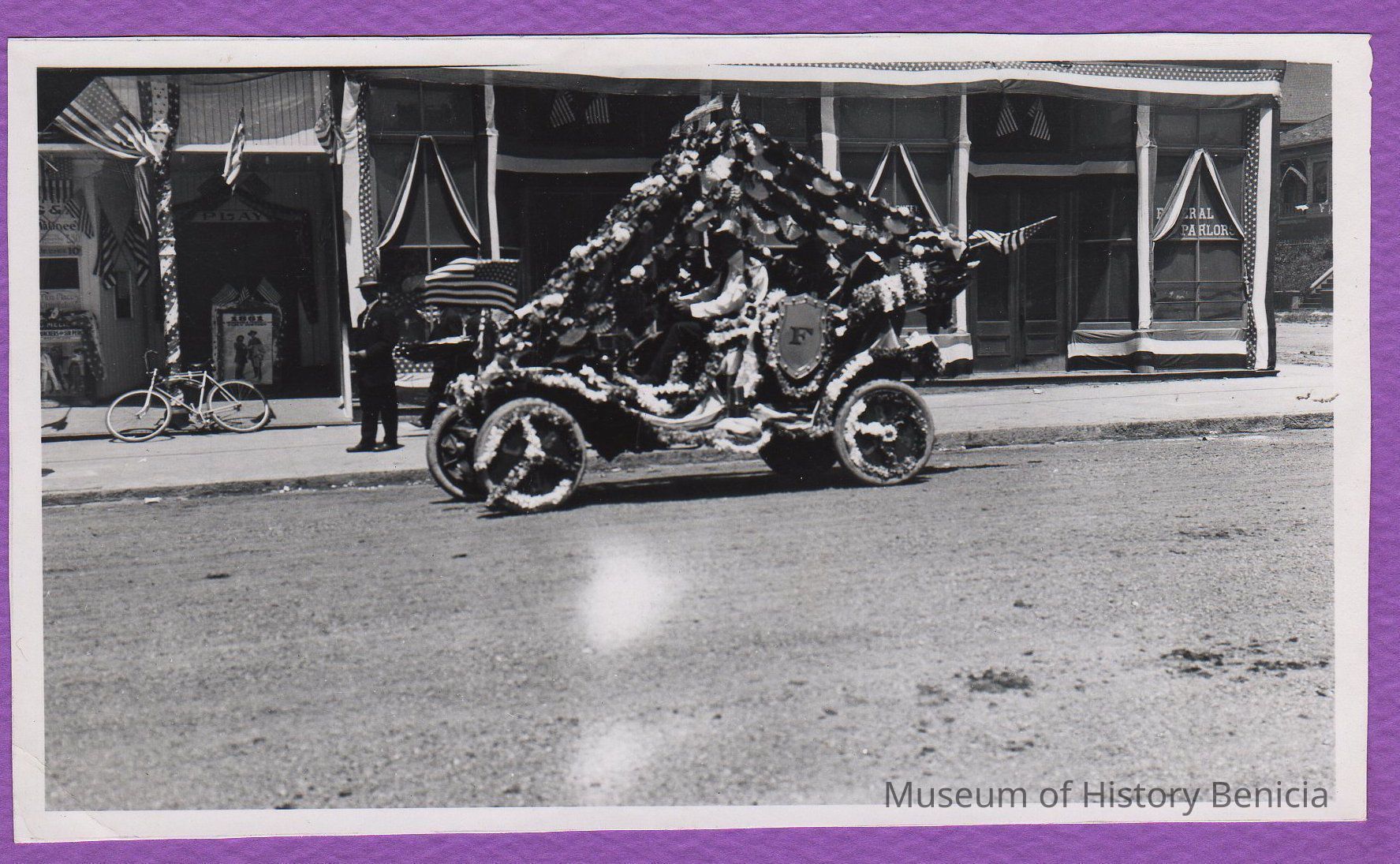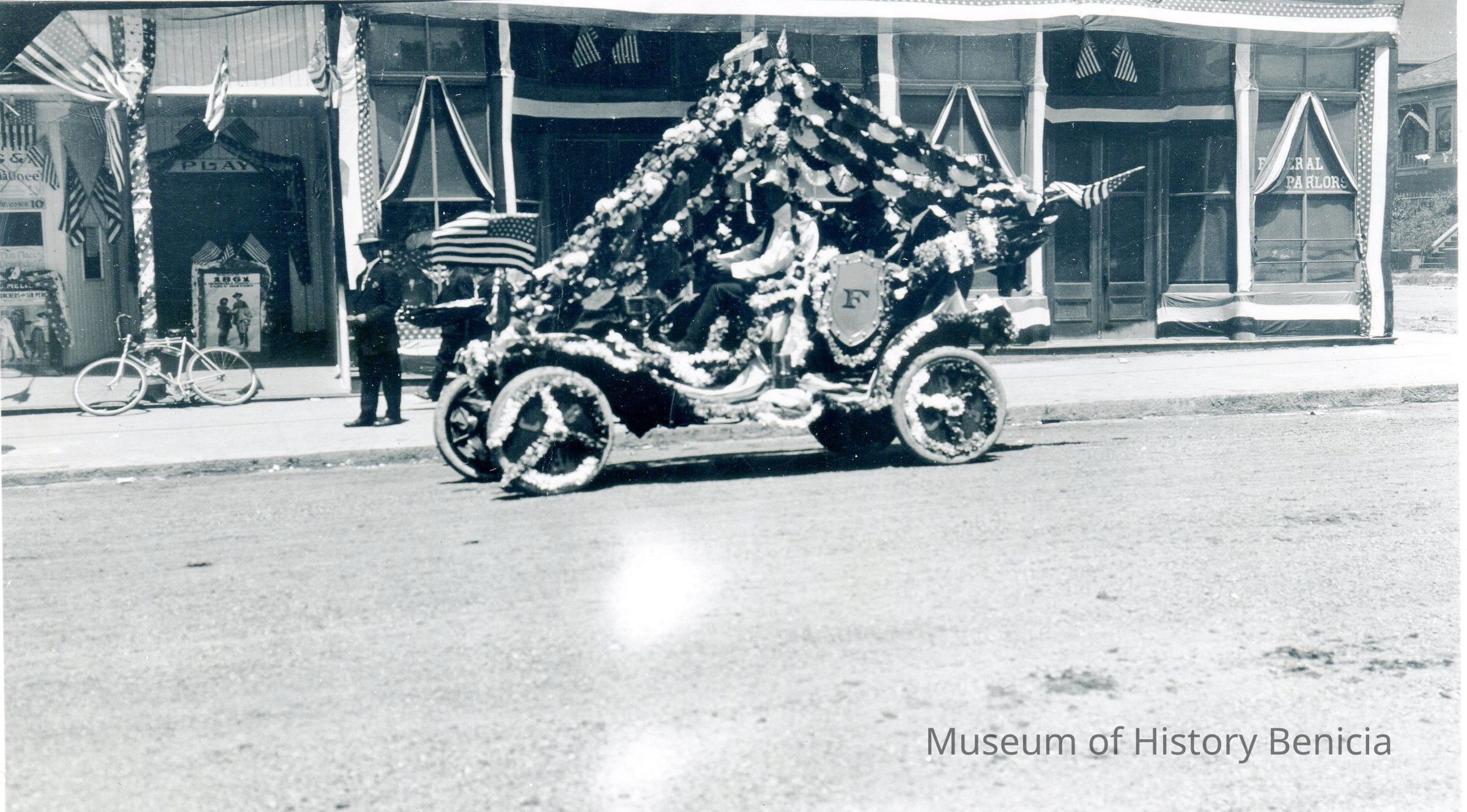 B/W photograph: Early car decorated for Fourth of July parade. A house in the first block of West J street can be seen to the far right. Also a Funeral Parlor is on the southwest corner of the intersection of First and J Streets. To the left are advertisments for a play, admission is 10 cents.Collection