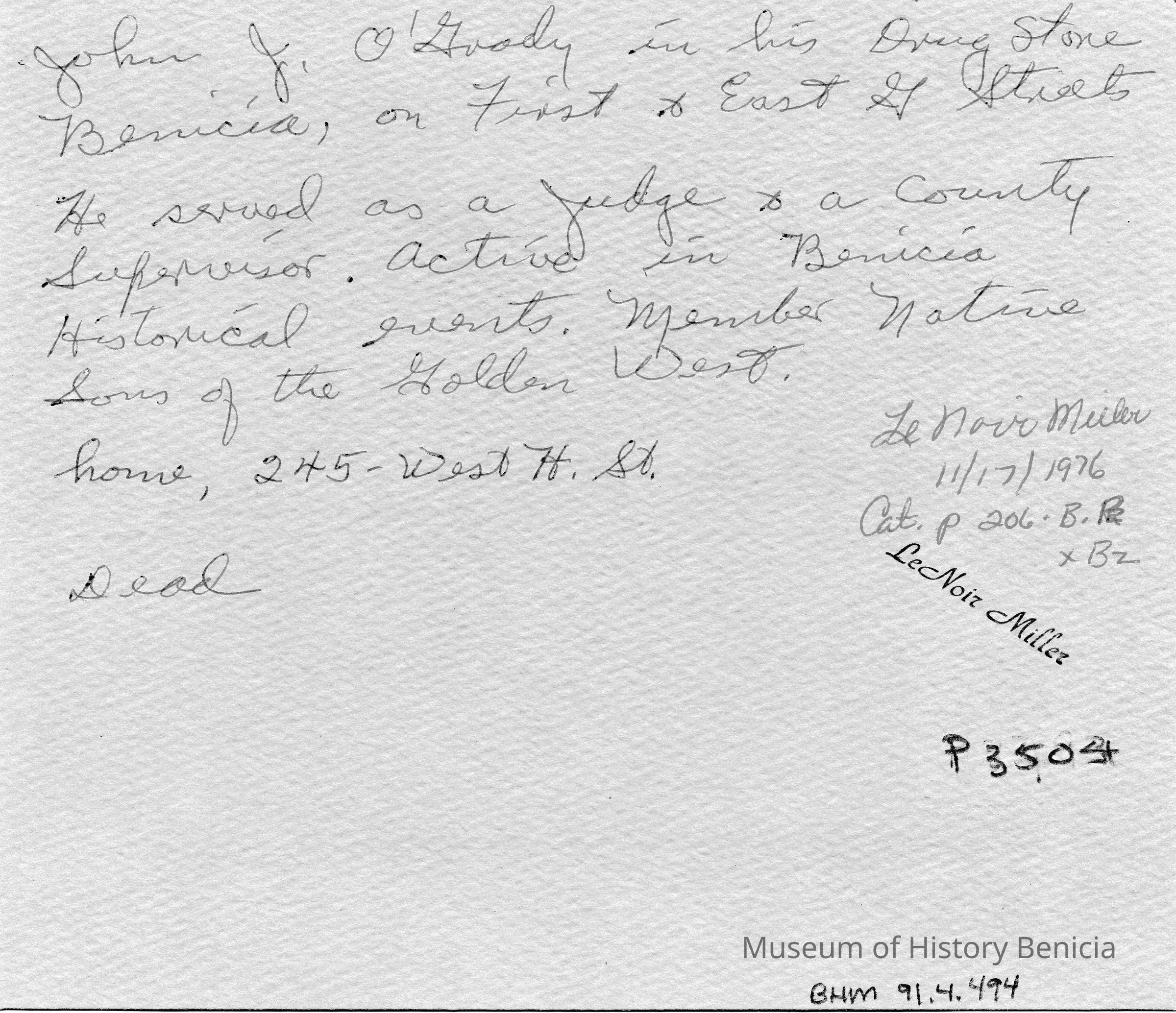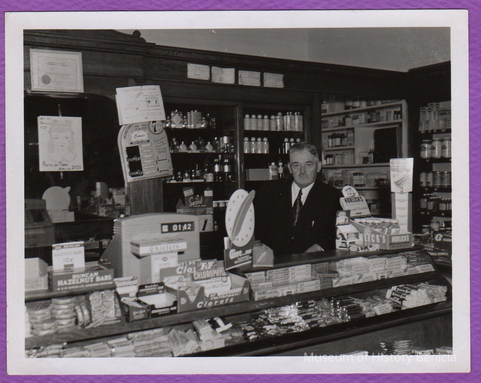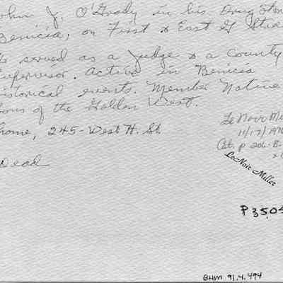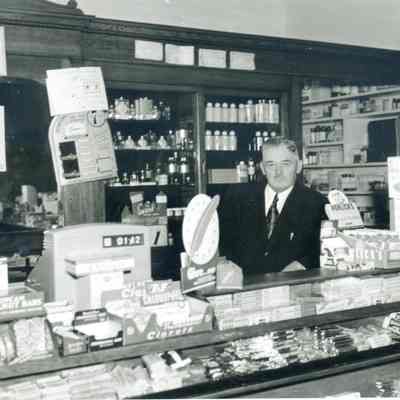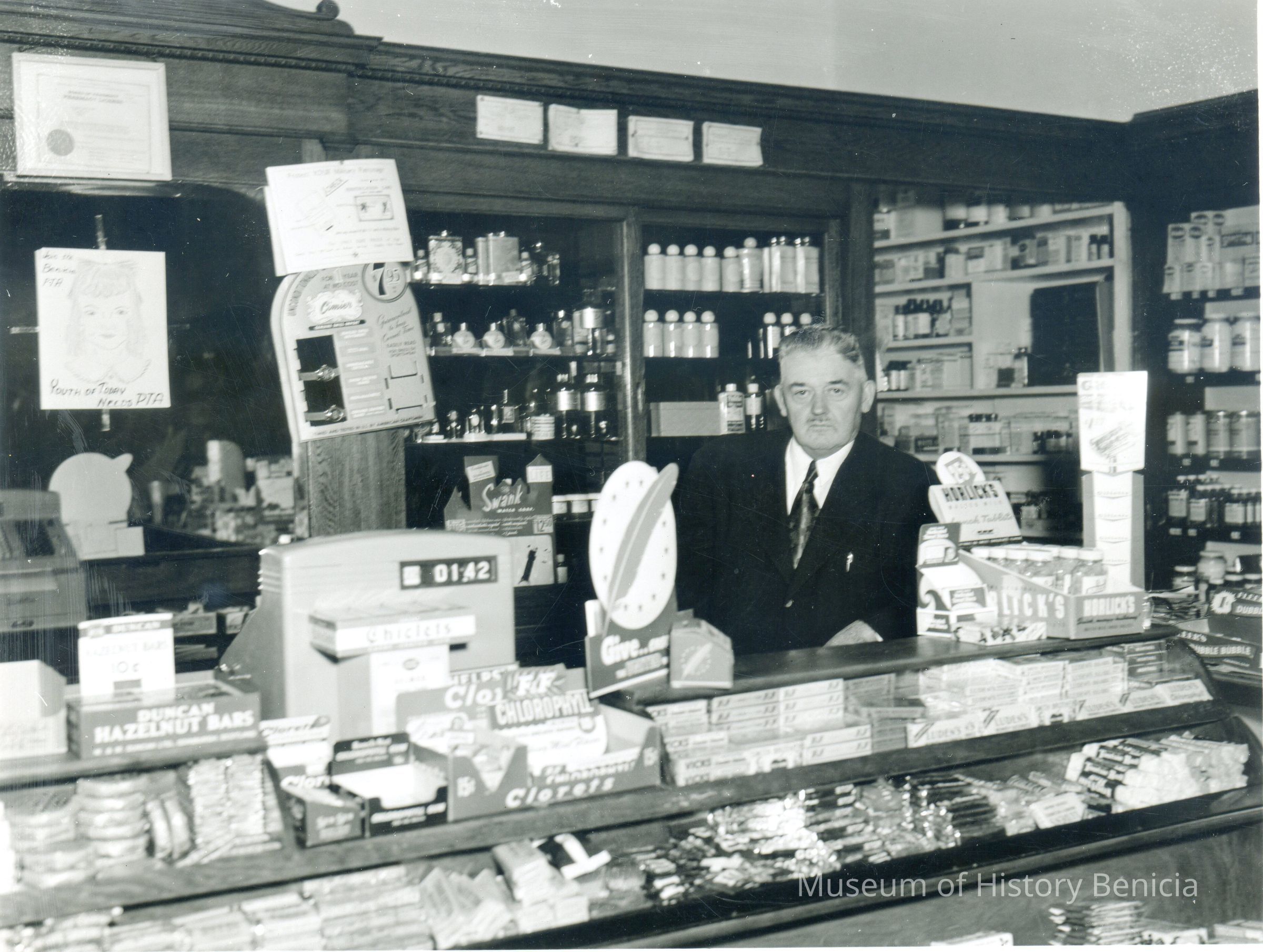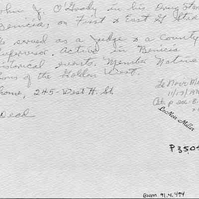 B/W Photograph: John O'Grady in his drug store at First and East G Streets. He served as a judge and as a co. supervisor. His home was at 245 West H Street. He was active in Benicia Historical events and was a member of the Native Sons of the Golden West.Collection