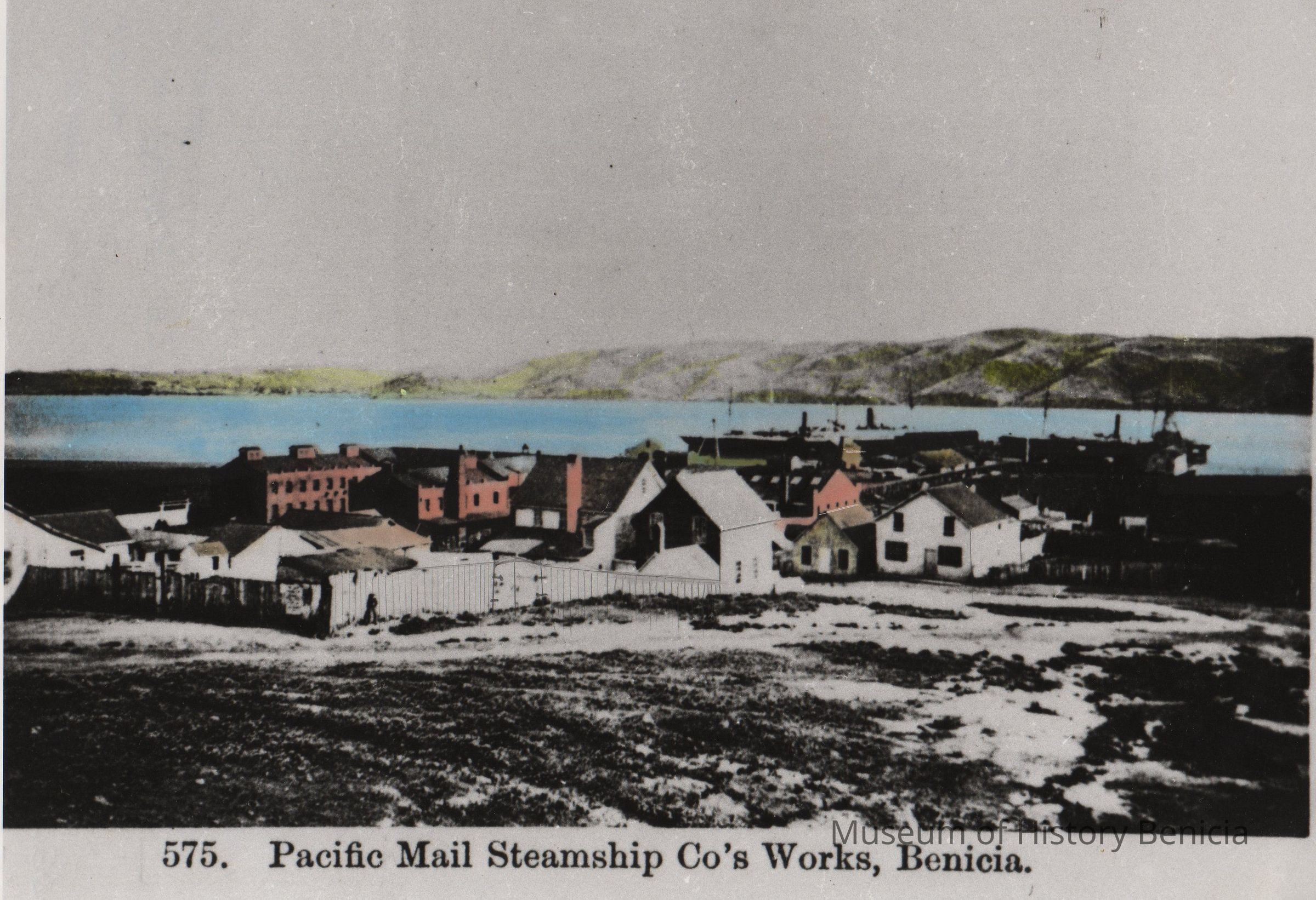 B/W hand-colored photograph: view of Pacific Mail Steamship Company Works, Benicia, circa 1860s. Photo shows two paddlewheel steamers at the dock and the buildings of the works.Collection