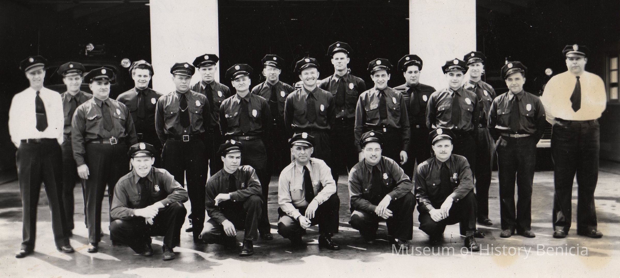 B/W Photograph: Benicia Fire Department 1949-1954. Names on back of photo: Front row: "Truman Lantrip, Thomas Gieffels, Fire Chief Bill Davena. Joe Maia, Adolph Botti. Second Row: Leon McKee, Bill DeSilva, Gene Jackson _____?, Roland Rafael. Ray Lewis. Manuel Pedro, Tony Azevedo, Jerry Dana. Third Row: Paul Ford. Bob Ennis, Orval Lantrip, Delmar Clyma. Pete Petersen, George Borges and Leonard Ramberg."Collection