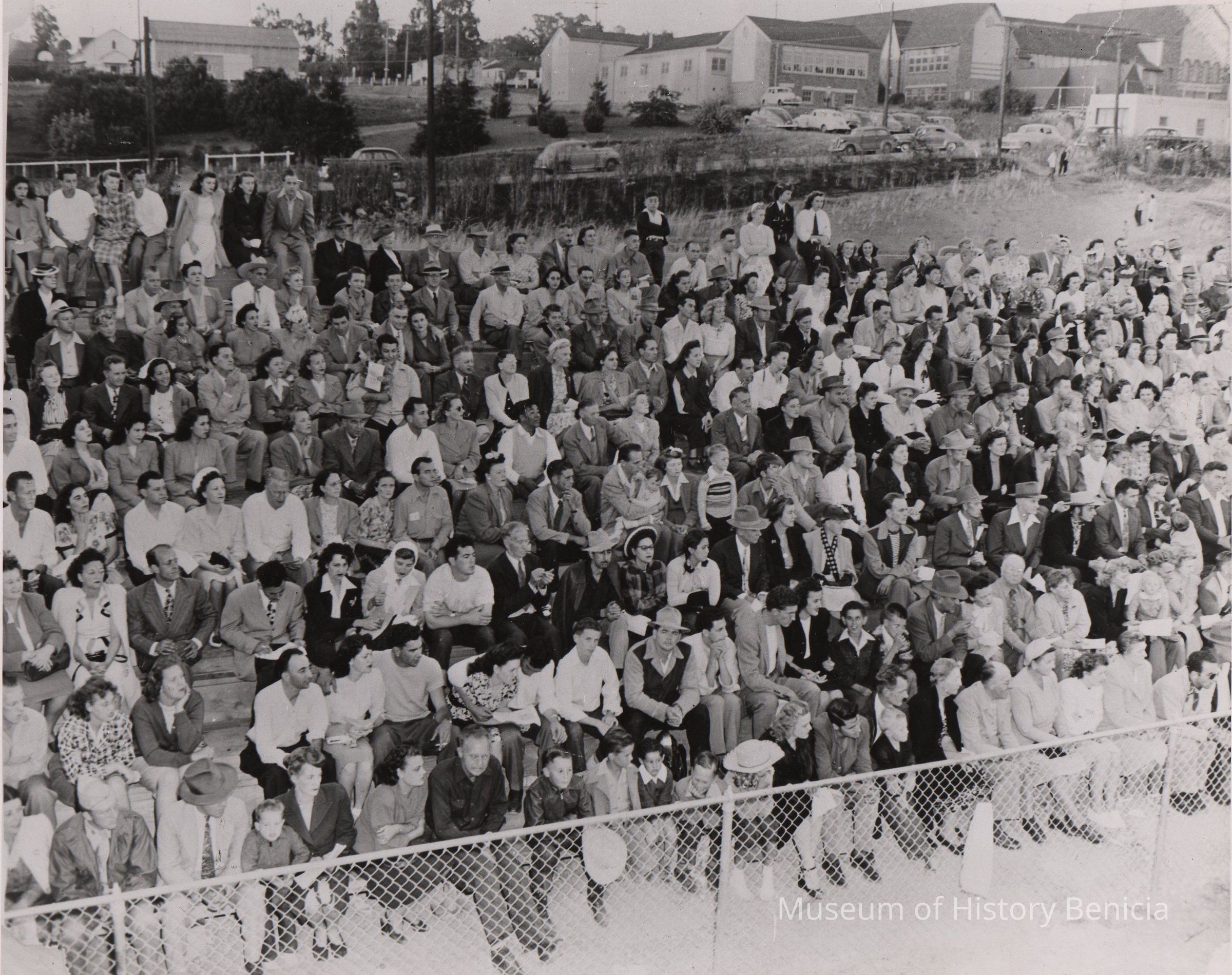 B/W Photograph: A crowd of Benicia citizens are seated in bleachers at the original city James Lemos swimming pool watching an aquacade/ syncronized swimming show as part of the Centenniel Celebration of the City of Benicia during June 13, 14, 15, 1947.