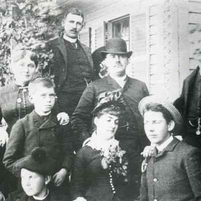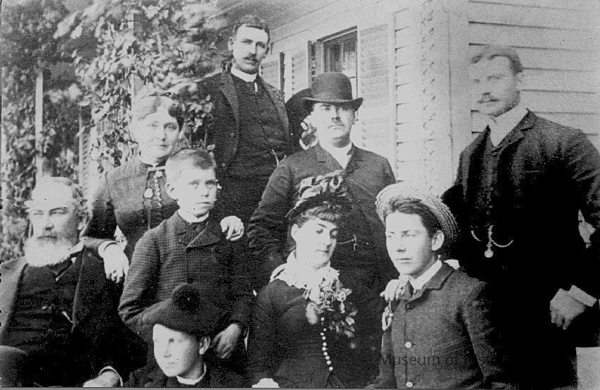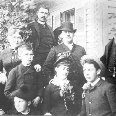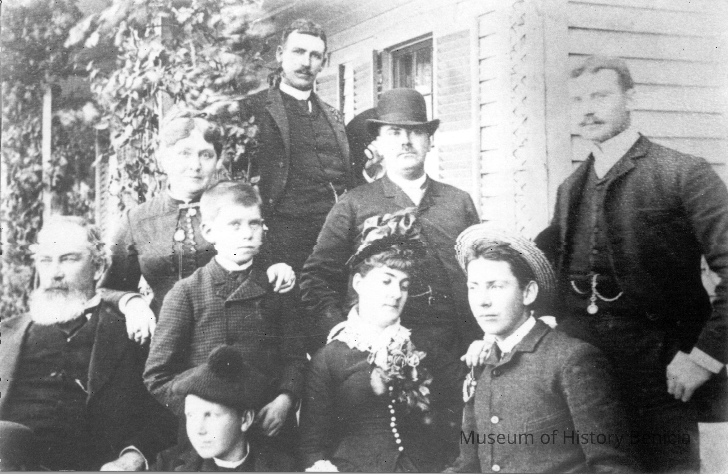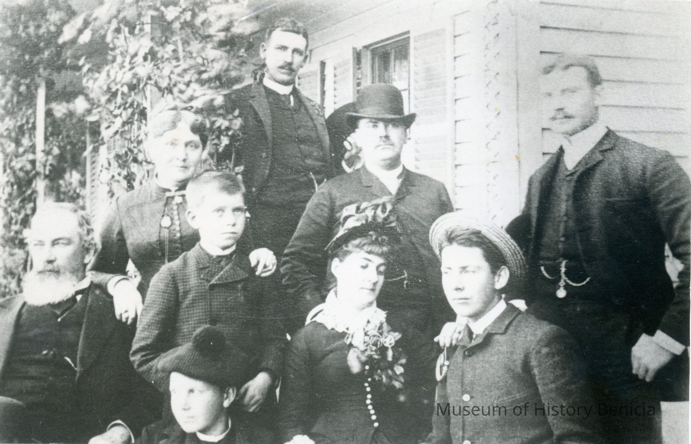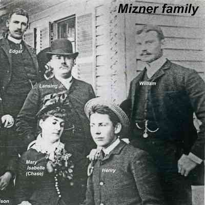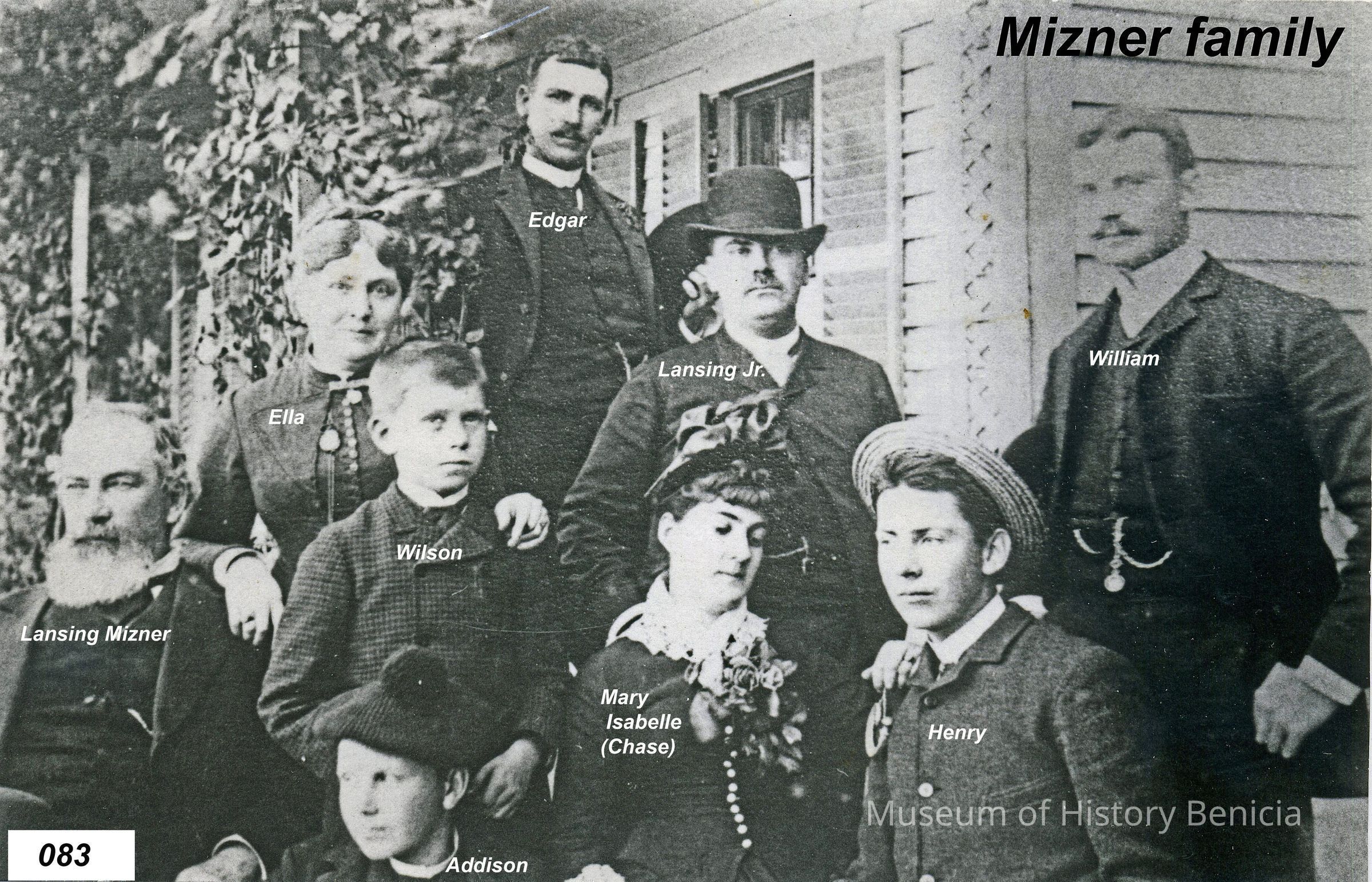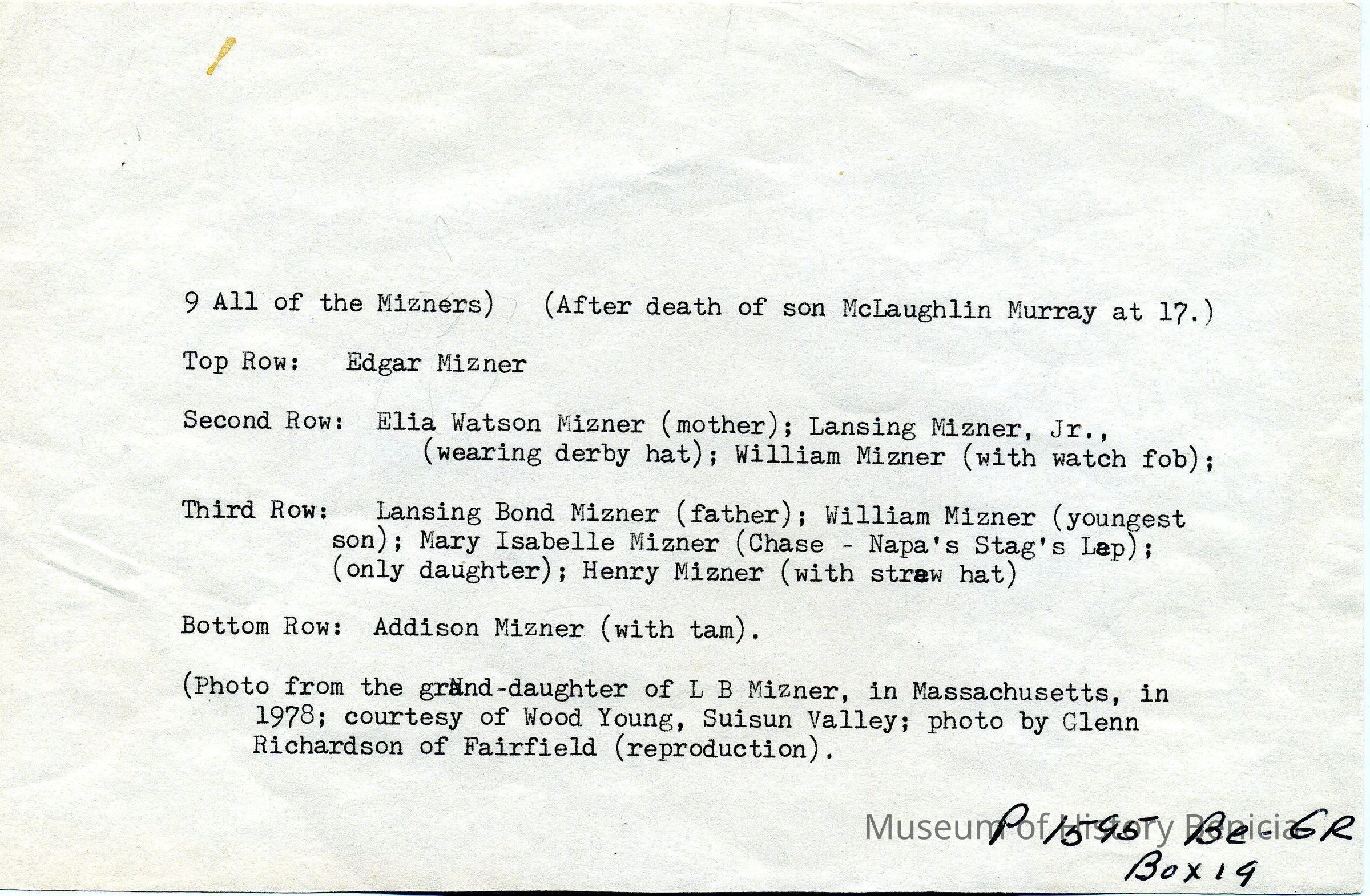 B/W photo of all nine Mizner family members. Sheet of Paper explains "9 All of the Mizners) (After death of son McLaughlin Murray at 17) Top Row: Edgar Mizner, Second Row: Elia Watson Mizner (mother); Lansing Mizner, Jr. (wearing derby hat); William Mizner (with watch fob); Third Row: Lansing Bond Mizner (father); Wilson Mizner (youngest son); Mary Isabelle Mizner (Chase - Napa's Stag's Leap); (only daughter); Henry Mizner (with straw hat). Bottom Row: Addison Mizner (with tam). (Photo from the grand daughter of L B Mizner, in Massachusetts, in 1978; courtesy of Wood Young, Suisun Valley; photo by Glenn Richardson of Fairfield (reproduction)." Mizners' history is found on pages 180-190 of the book "Great Expectations".Collection
