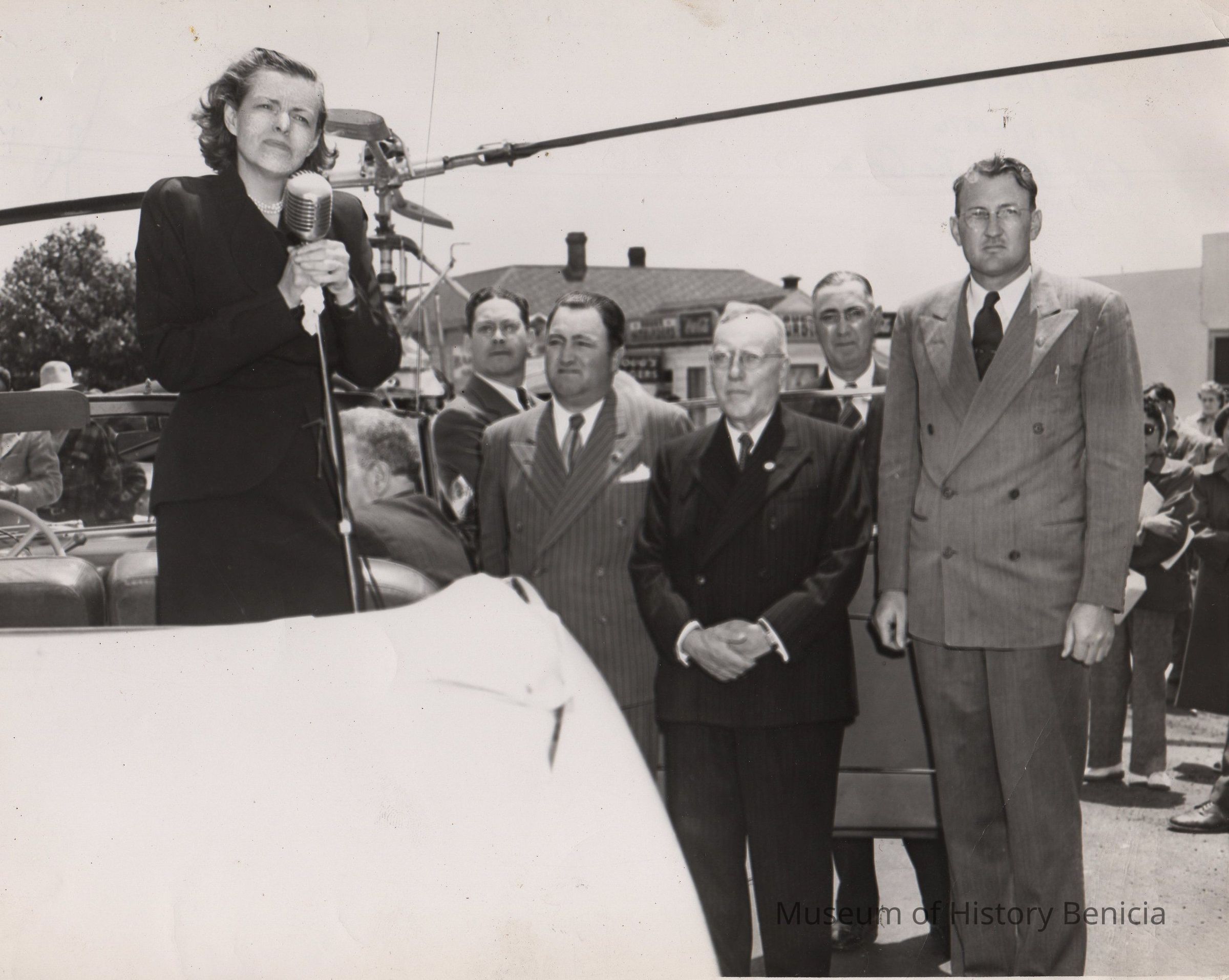 BW Photograph: Helen Gahagan Douglas campaigning for U.S. Senator in Benicia when she ran against Richard Nixon. Also shown to her left are Sol Rose, Harold Simons two unidentified men and Michael FitzGerald.