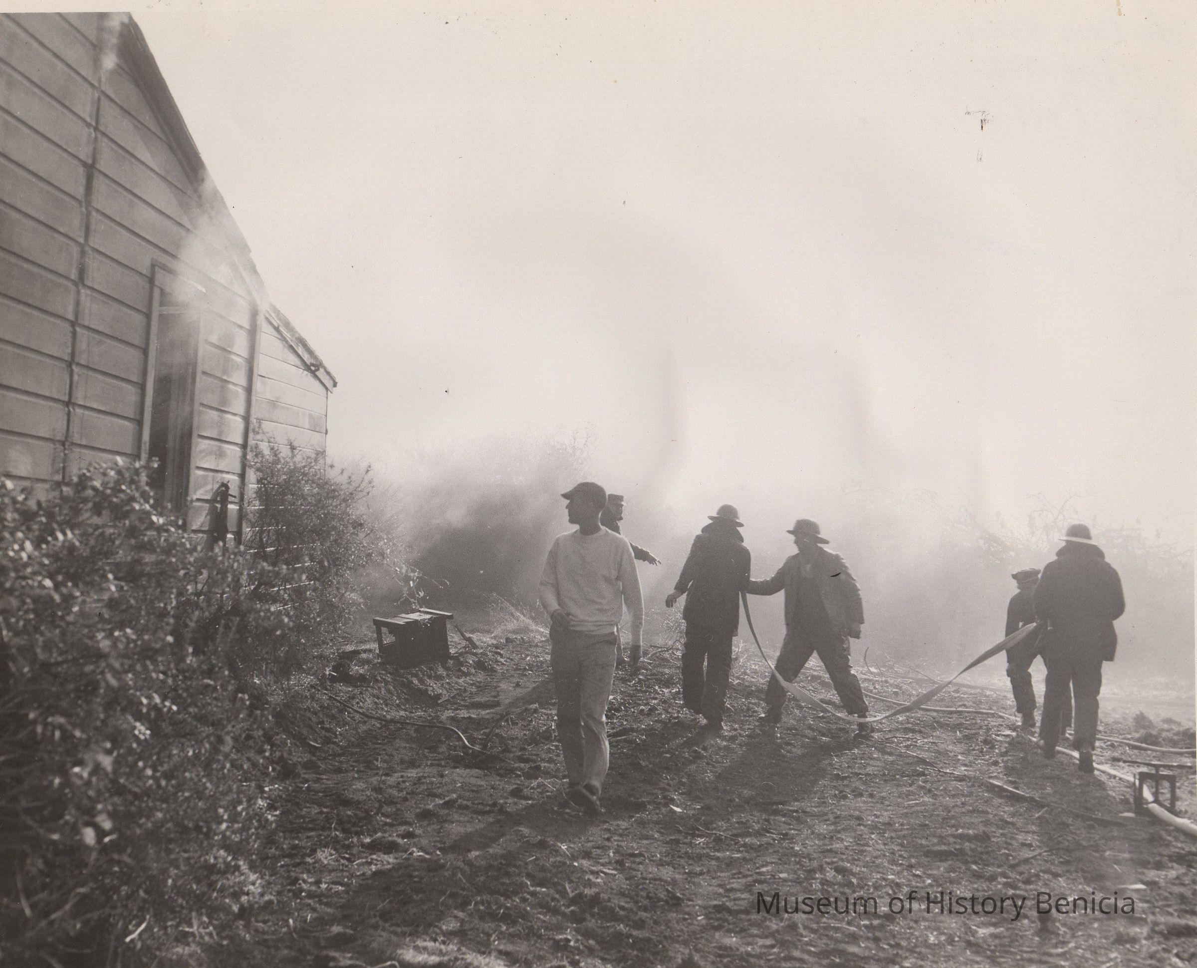 This is one of a set of five photographs which are most likely depicting a fire department exercise in burning down an old building.Collection