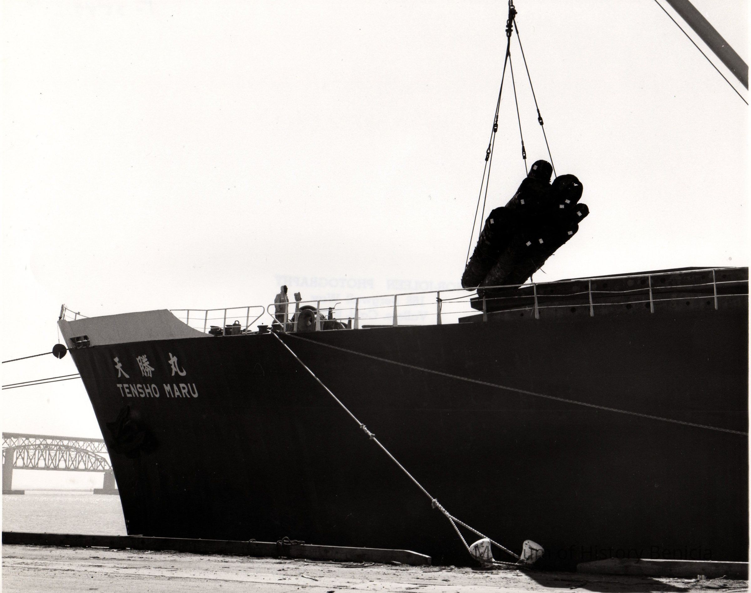 B/W photograph: Side view of ship "Tensho Maru" loading at dockside.