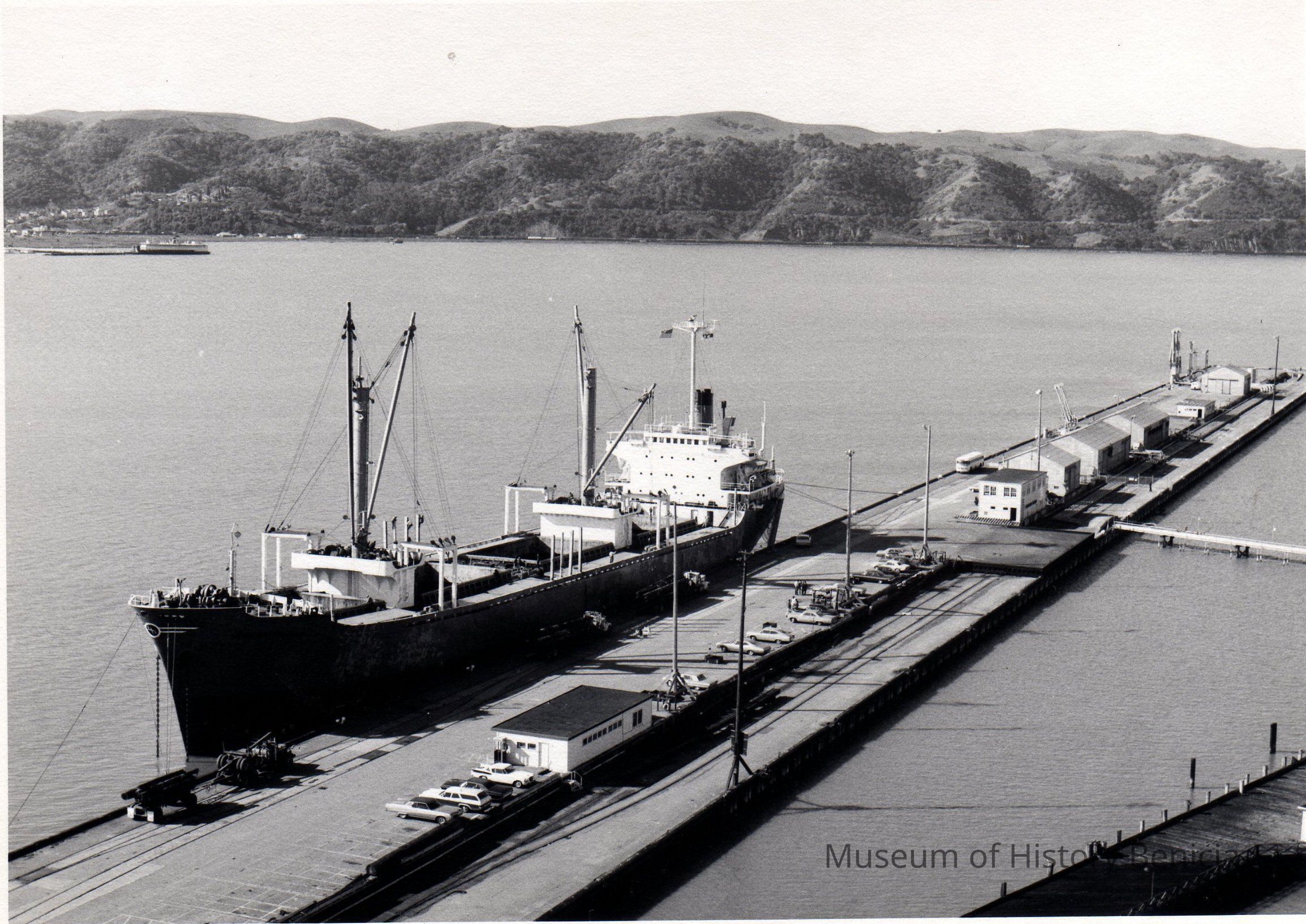 B/W photograph: Cargo ship at dock. Flatbeds with logs alongside.
