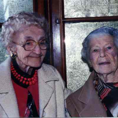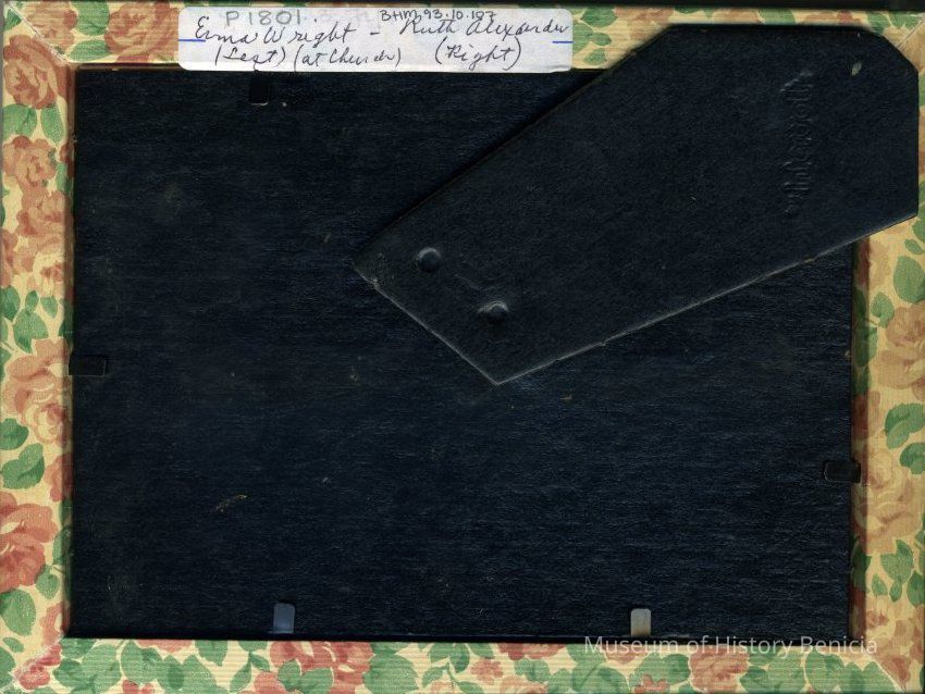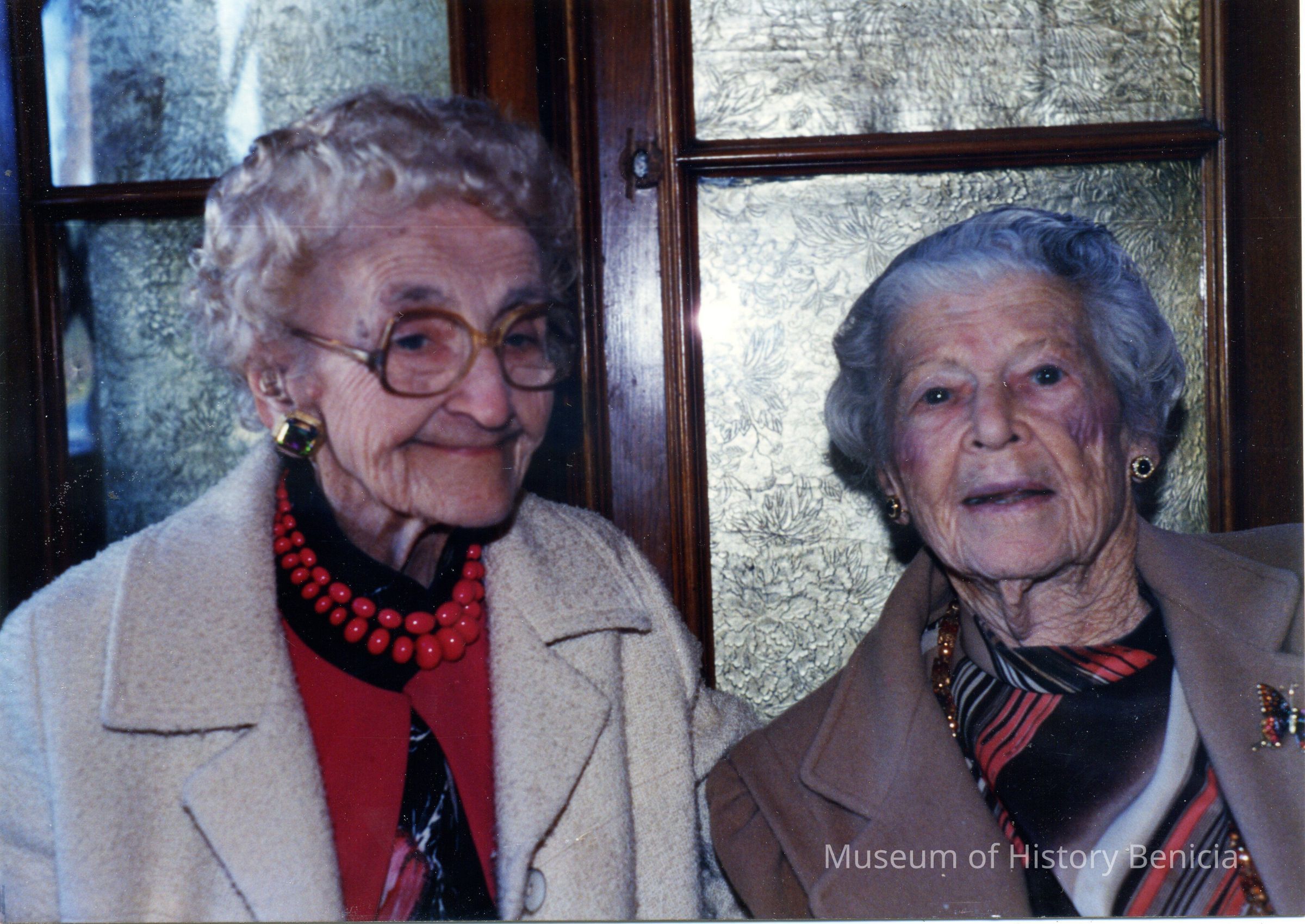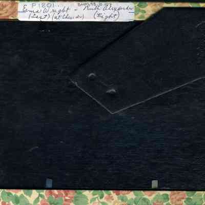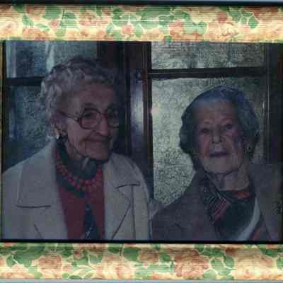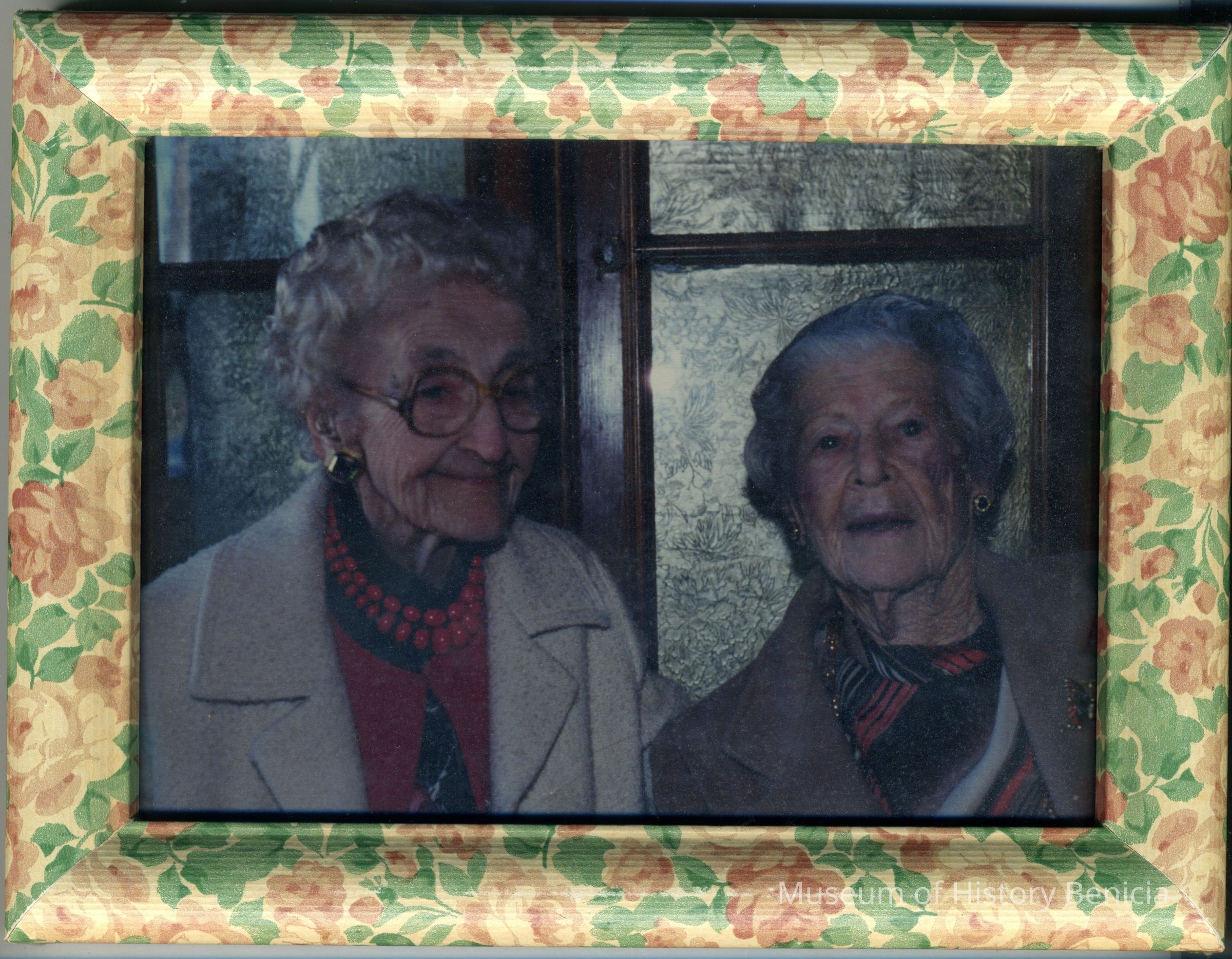 Bust length view of two older women: Erma Wright at left in red and black with off-white coat, and Ruth Alexander at right in black, red and white dress with brown coat. Color photo, in rectangular frame with rose-and-leaf design.Collection
