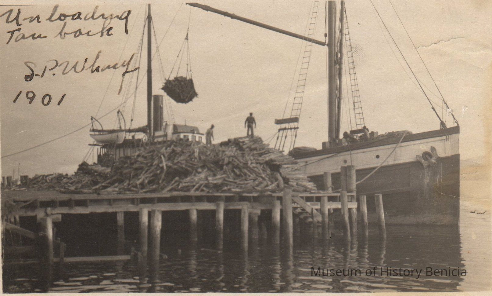B/W photograph: "Unloading tan bark [at] S. P. [Southern Pacific?] Wharf, 1901."