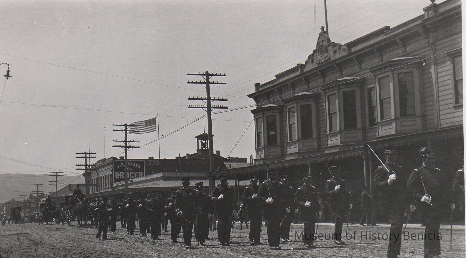 B/W Photograph: Men in military uniforms parading on First Street just north of H Street. J.R. Fraser Grocery in background. The word "Stumm" is written on the back in pencil. Not sure by whom.Collection