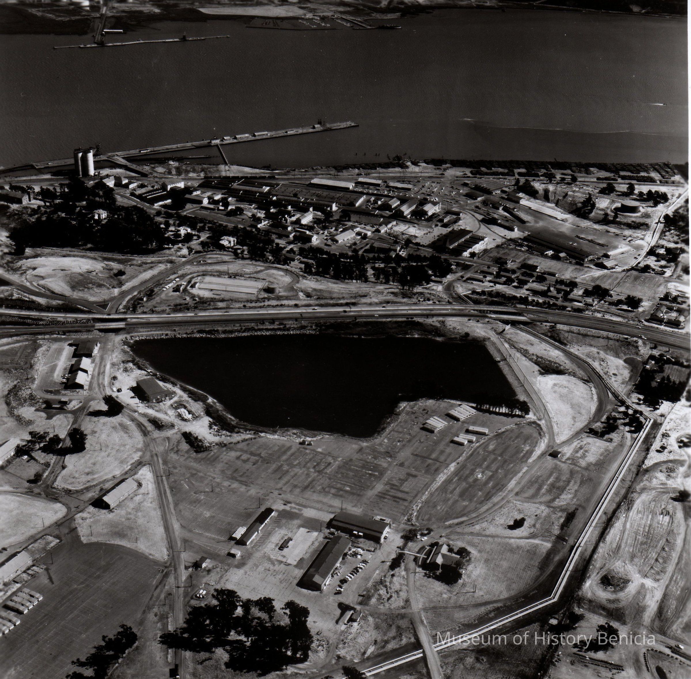 B/W aerial view with Pine Lake in foreground, port, dock, and Carquinez Strait in background.