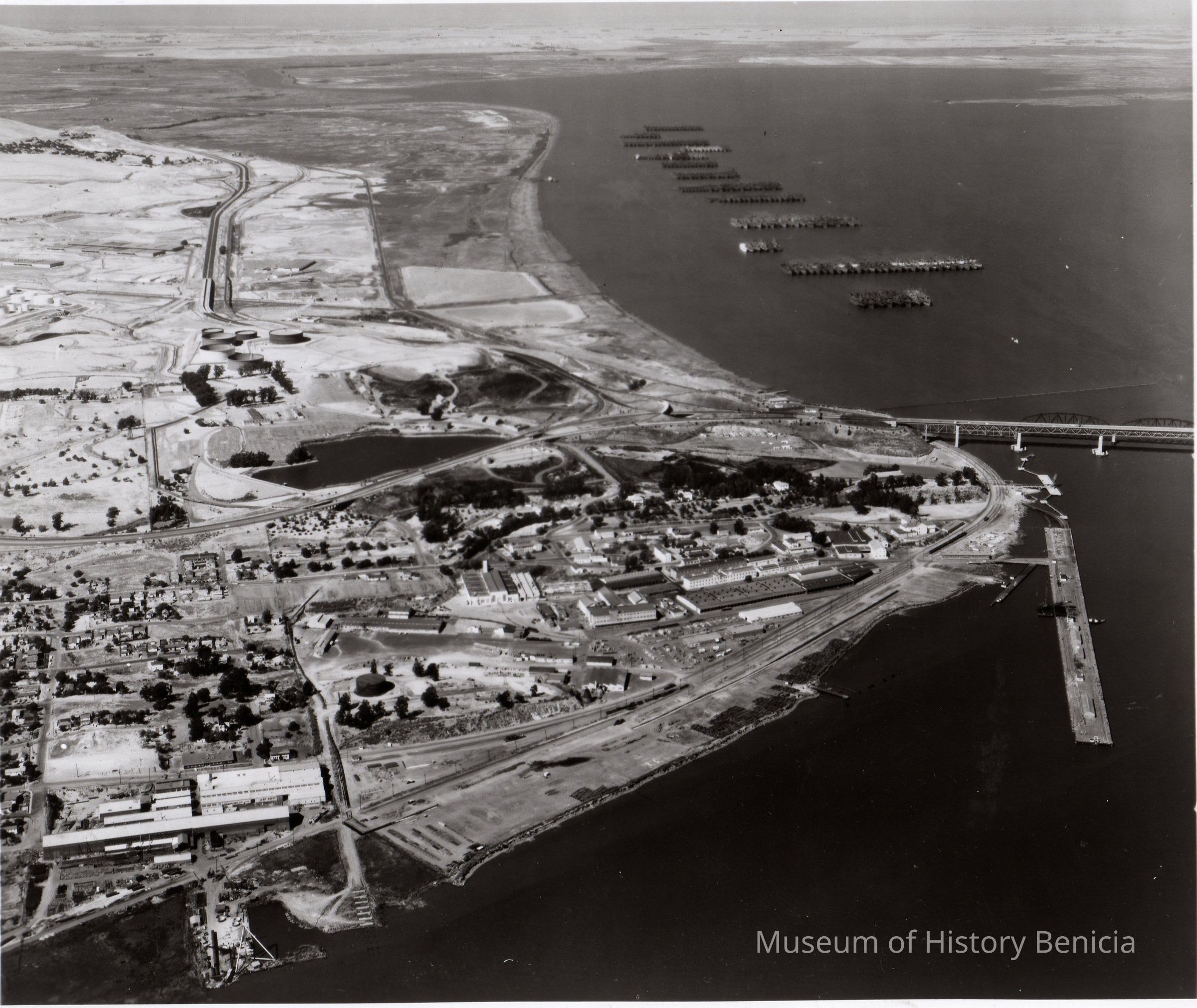 B/W Photograph: Aerial view from west looking east at Port of Benicia, with Mothball Fleet in background.