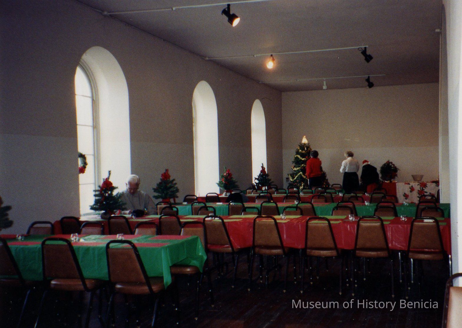 Color photo showing decorations, Christmas tree, in preparation for Camel Barn Christmas party 1991.