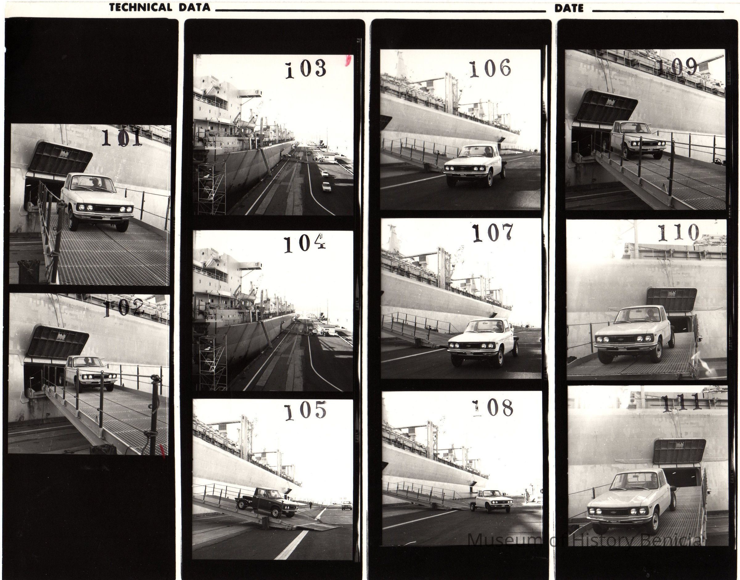 B/W proof sheet with eleven photos on one page showing the unloading of autos and trucks, off a vehicle carrier ship.