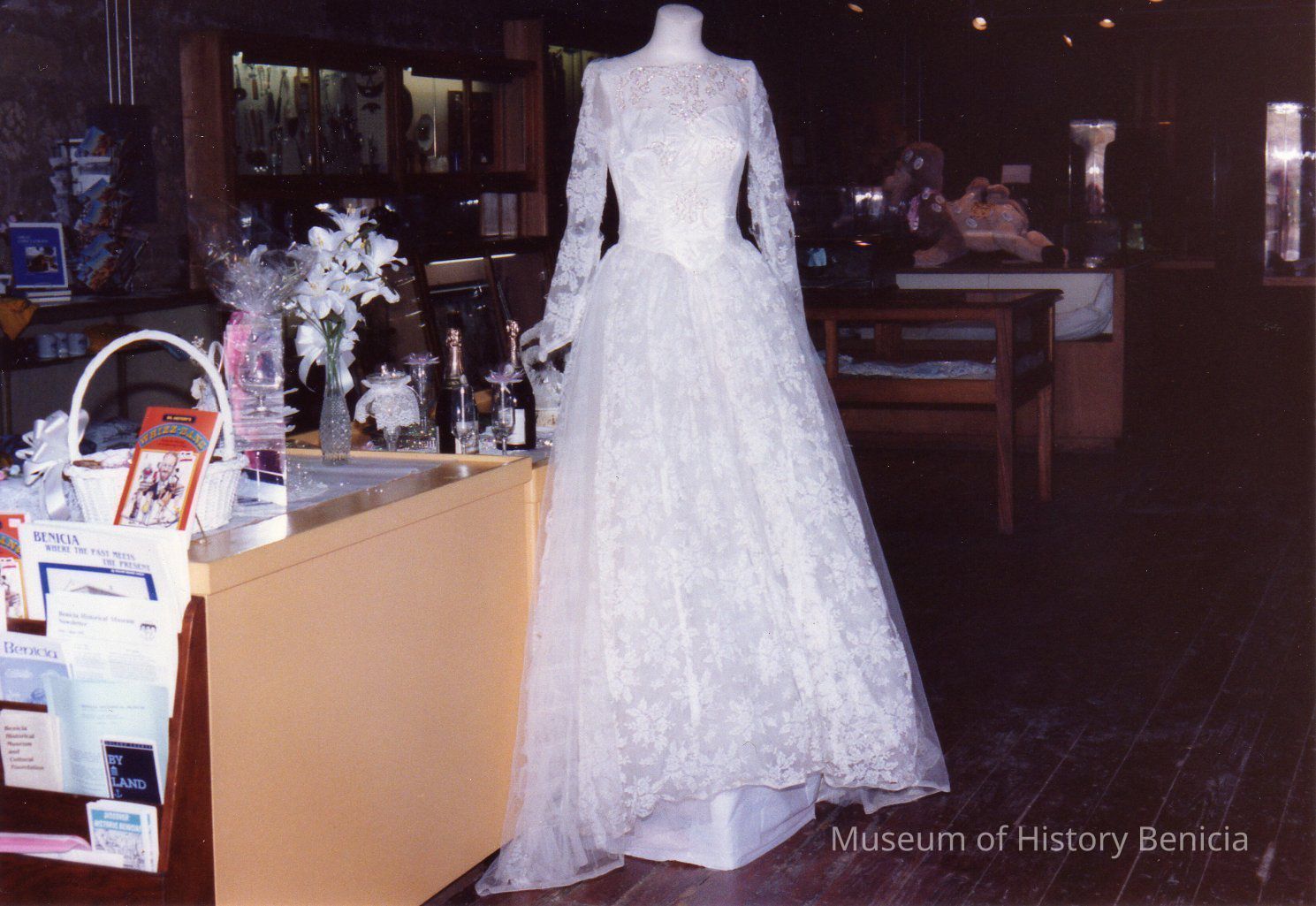 Mother's Day Tea, 1992: fundraiser for the museum. color photo of long white dress on a maniquin on display in the museum.