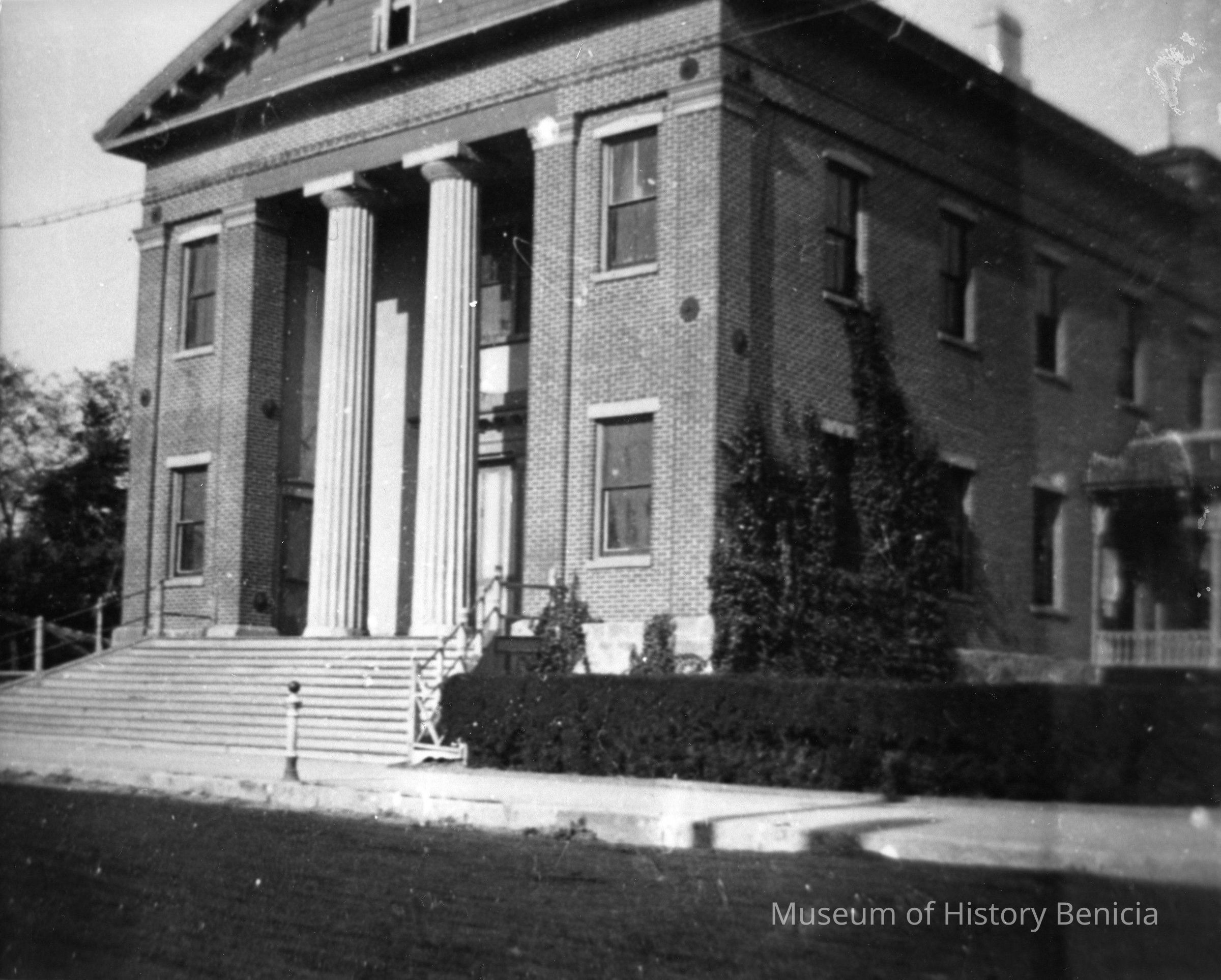 B/W photo of front of Benicia State Capitol building on corner of First and G Streets. Photo shows side entrance.