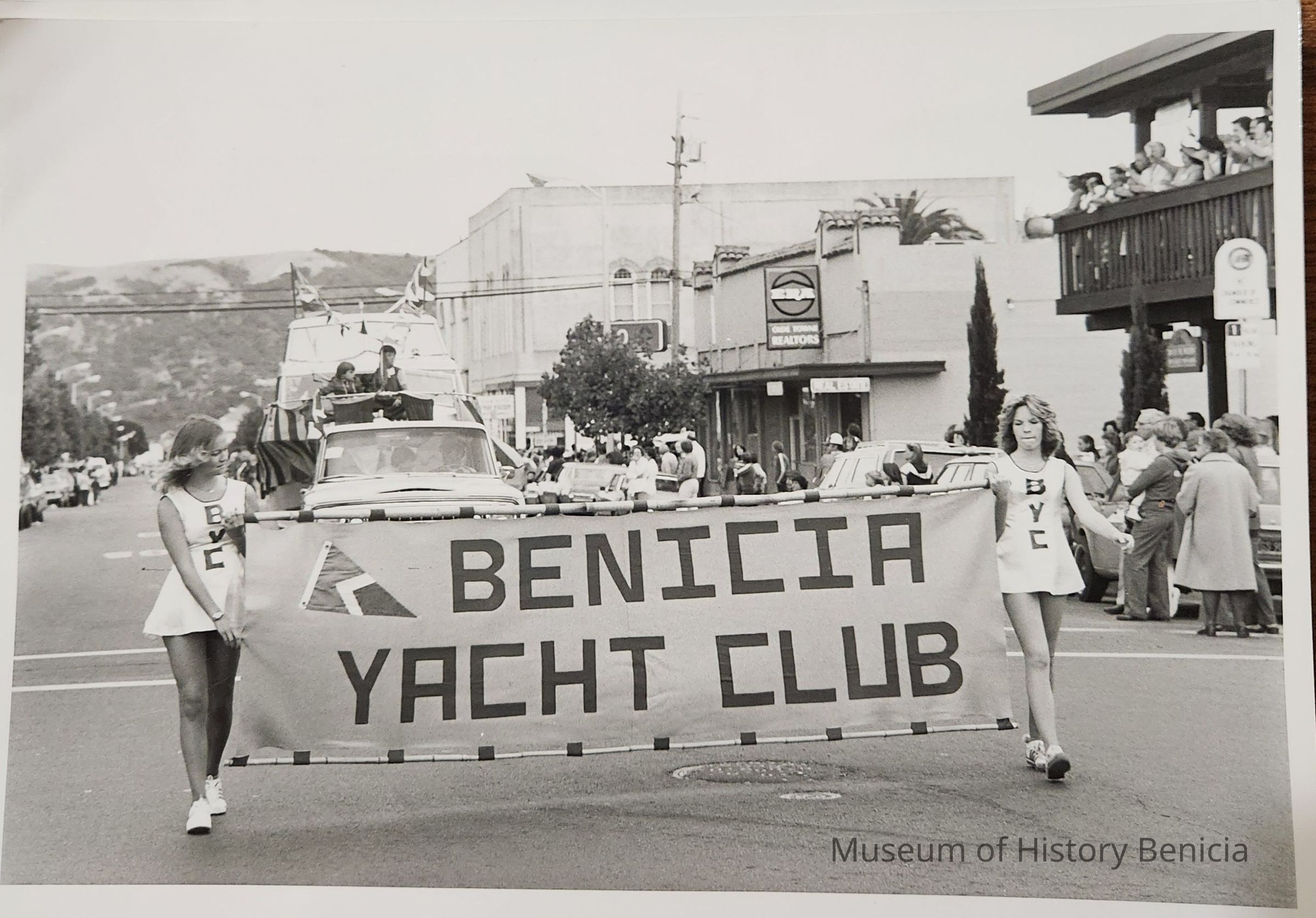 B/W Photographfrom the 1979 Third of July Torch Light/First Annual Sister City Celebration Parade. The parade route was from the foot of First Street to the City Park. In the photograph two young ladies are carrying a sign in front of the "float"/boat sponsored by the Benicia Yacht Club. The young lady on the left is Julie Hellquist Dinsdale and the one on the right is Anne Benefiel Hathaway. Members of the Sister City Delegation can be seen in the upper right on the balcony of the Independence Savings and Loan, occupying the building at that time.Photograph Details