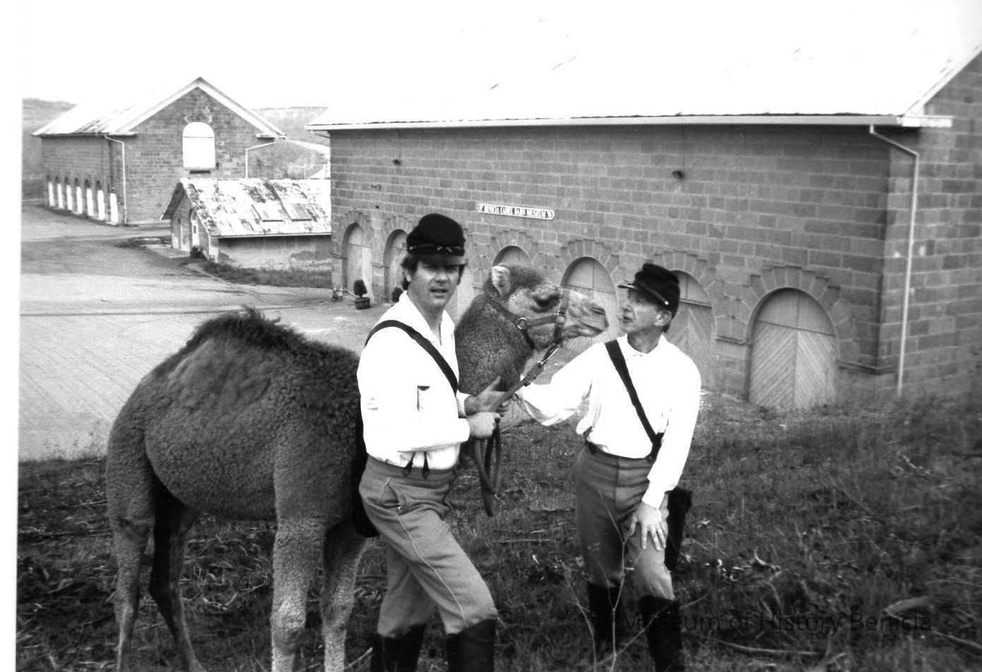B/W photograph, caption on back: "Atar" the Marine World Africa USA camel visits the Camel Barns along with Civil War buffs Dave Stevens and Larry Rogers. Photo by: Tom HosleyCollection
