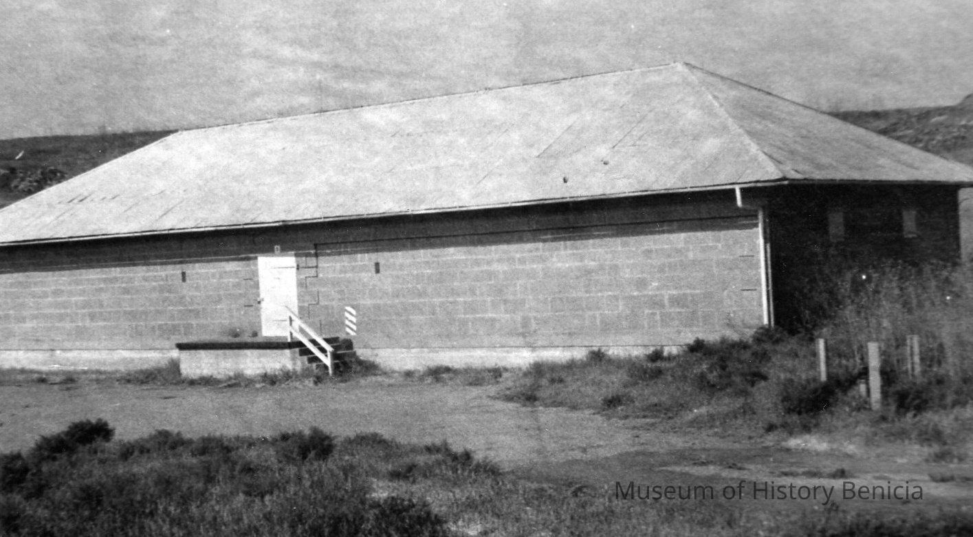 B/W Photo taken from Benicia Arsenal Manual. Building #2 - Magazine 1855 Cost $30,012. Stone walls with corregated iron roof and wood trusses. 35.6' x 104' and 2414 sq. ft. area. Floor - wood. (per label on back of photo)