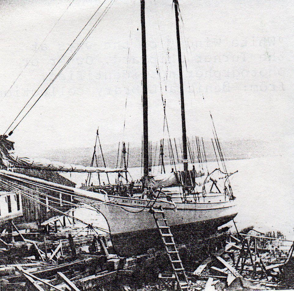 Ship "White Wings" on the ways at Turner Shipyard. B/W photocopy of a photo from the Benicia Public Library collection.